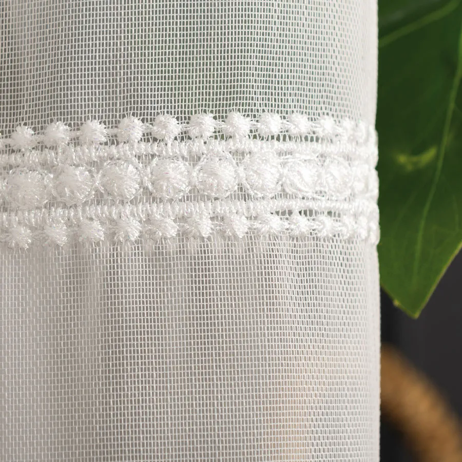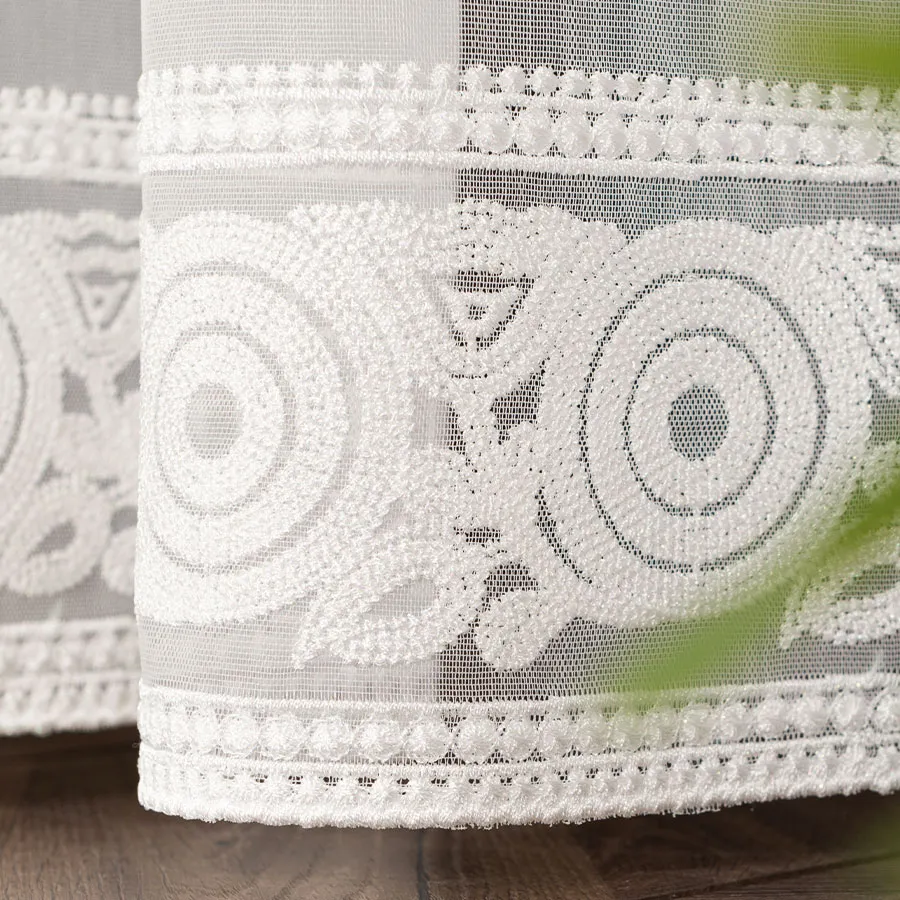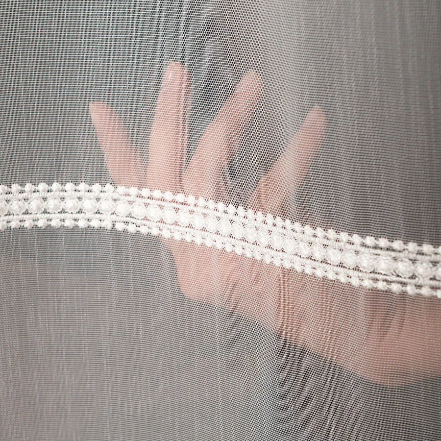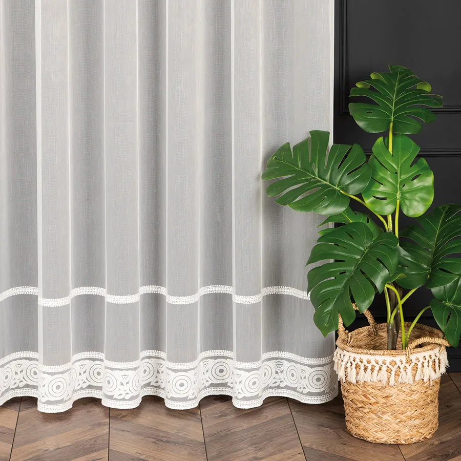 Haftowane wzory w formie dwóch pasów na dole firanki dodają jej delikatności i subtelności, jednocześnie nadając jej wyjątkowego charakteru.