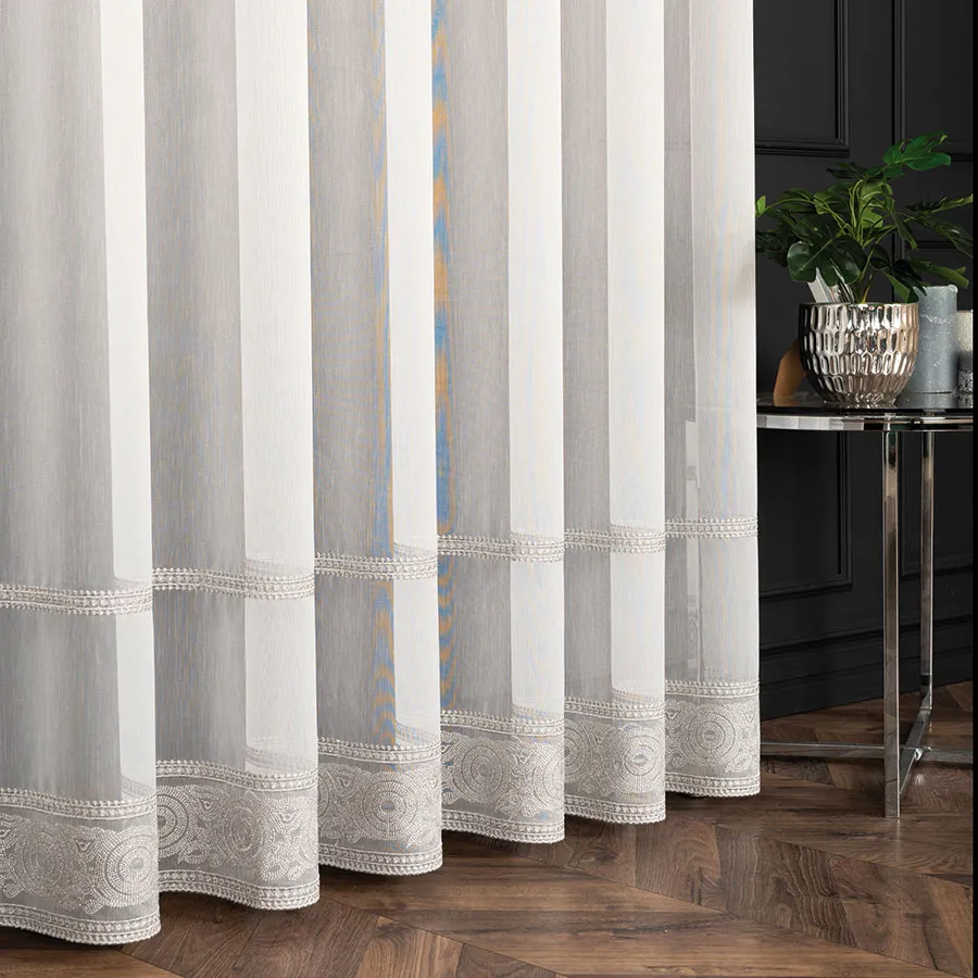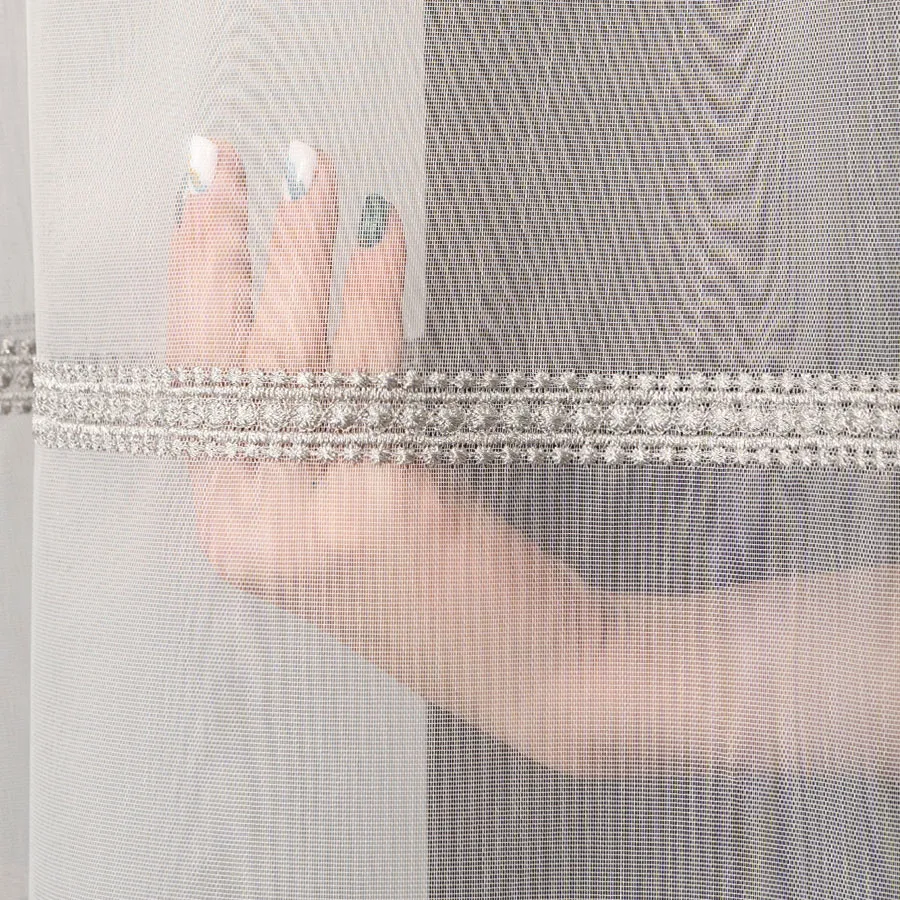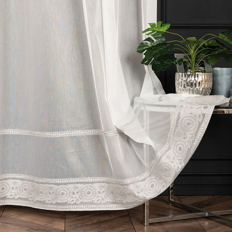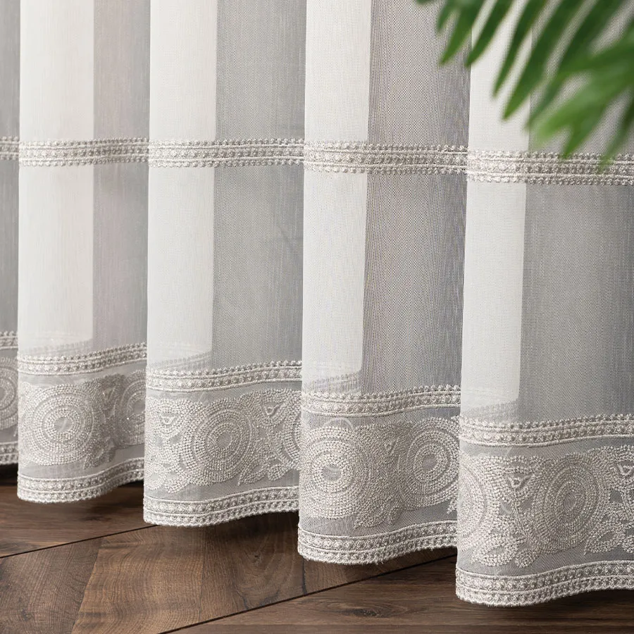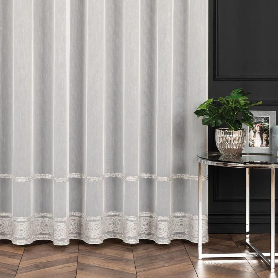 Haftowane wzory w formie dwóch pasów na dole firanki dodają jej delikatności i subtelności, jednocześnie nadając jej wyjątkowego charakteru.