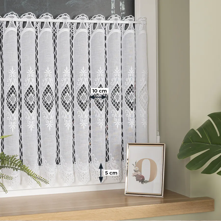 Ta haftowana firanka jest idealna dla osób, które cenią sobie eleganckie i stylowe dodatki w swoim domu. Dostępna jest w dwóch różnych wysokościach, abyś mógł dopasować ją do swoich okien idealnie.