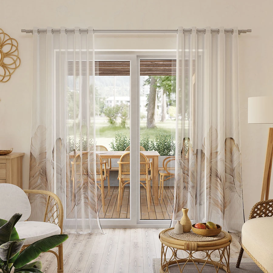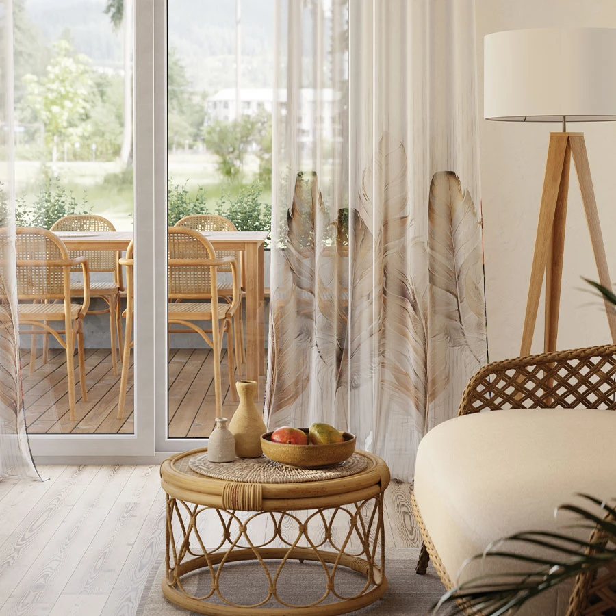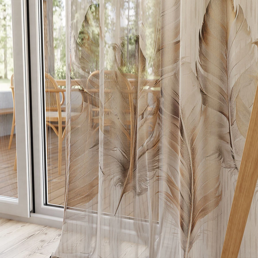 Firanka z motywem piór doskonale komponuje się z naturalnymi dodatkami, jasnymi kolorami i drewnianymi akcentami. Doda wnętrzu lekkości, tworząc spokojną, przytulną przestrzeń.