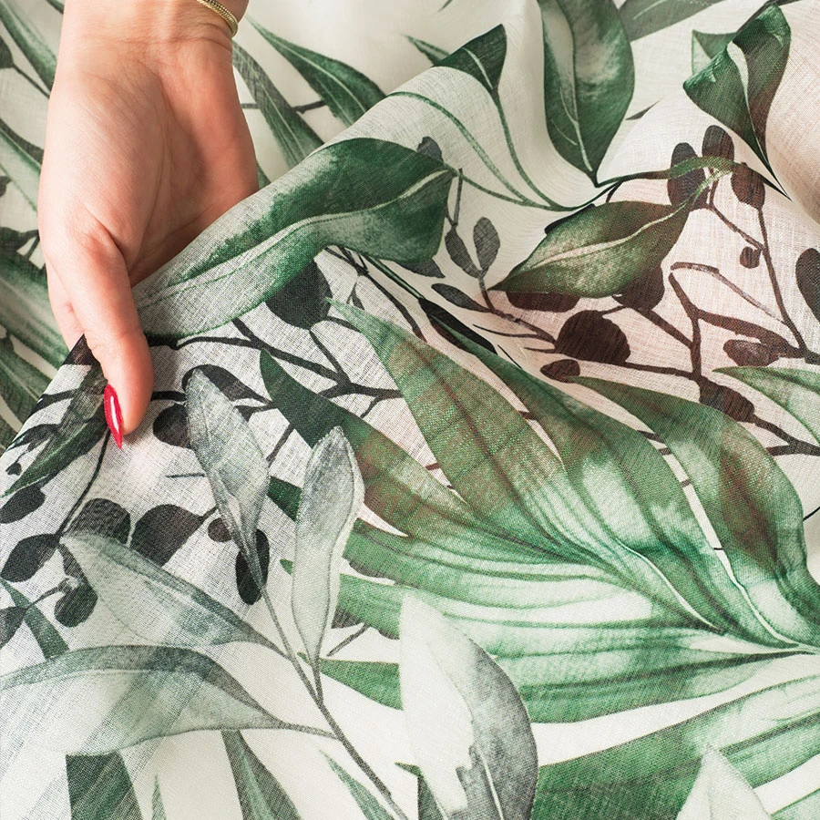 Lekka i zwiewna firana batystowa z nadrukiem liści to doskonały wybór dla osób ceniących naturalne akcenty we wnętrzach. Wykonana z delikatnej etaminy, przepuszcza dużo światła, tworząc jasną i przytulną atmosferę. Roślinny wzór w odcieniach zieleni nadaje pomieszczeniu świeżości i doskonale komponuje się z wnętrzami w stylu boho, skandynawskim oraz nowoczesnym.