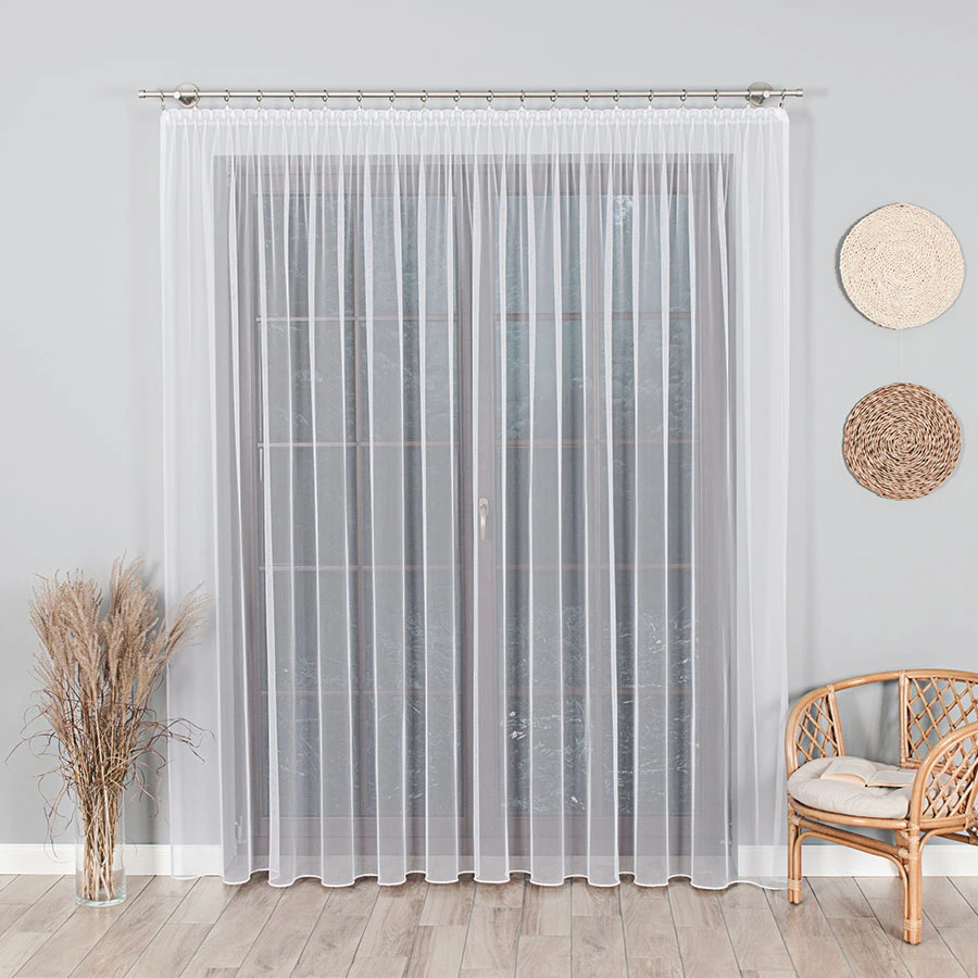 Firanka gładka z greckiego tiulu to doskonała propozycja dla osób poszukujących delikatnego i eleganckiego dodatku do swojego wnętrza. Wykonana z bardzo cienkiej i lekkiej tkaniny, doskonale przepuszcza światło, tworząc przyjemną atmosferę w pomieszczeniu. Dzięki wykończeniu u dołu ołowianką, pięknie się układa i delikatnie faluje, dodając wnętrzu subtelności. Biały i kremowy kolor firanki sprawia, że pasuje do każdego pomieszczenia i każdego wystroju. Bez zbędnych zdobień, stanowi doskonałą bazę do aranżacji wnętrza, pozwalając na swobodne łączenie z innymi dodatkami dekoracyjnymi. Firanka dostępna jest w metrażu, co pozwala dostosować jej długość do indywidualnych potrzeb i wymiarów okna. Jednym z atutów tej firanki jest również fakt, że nie wymaga prasowania - dzięki czemu utrzymanie jej w nienagannej formie jest bardzo proste i wygodne. Dzięki swojej uniwersalności i subtelności, firanka ta sprawdzi się zarówno w sypialni, salonie, jak i kuchni czy gabinecie. Dodając delikatności i lekkości, wprowadzi do wnętrza przyjemną atmosferę i stworzy harmonijną przestrzeń do wypoczynku i relaksu.