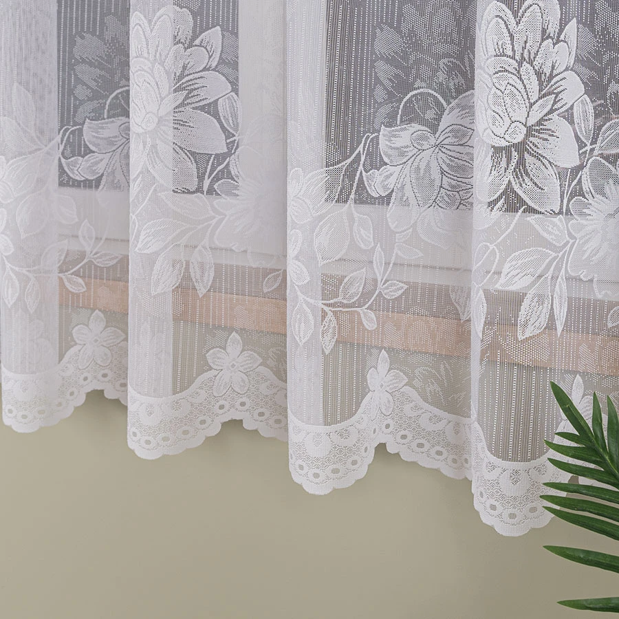 Piękny kwiatowy wzór w formie pasów sprawia, że ta firanka jest nie tylko praktyczna, ale również bardzo elegancka i stylowa