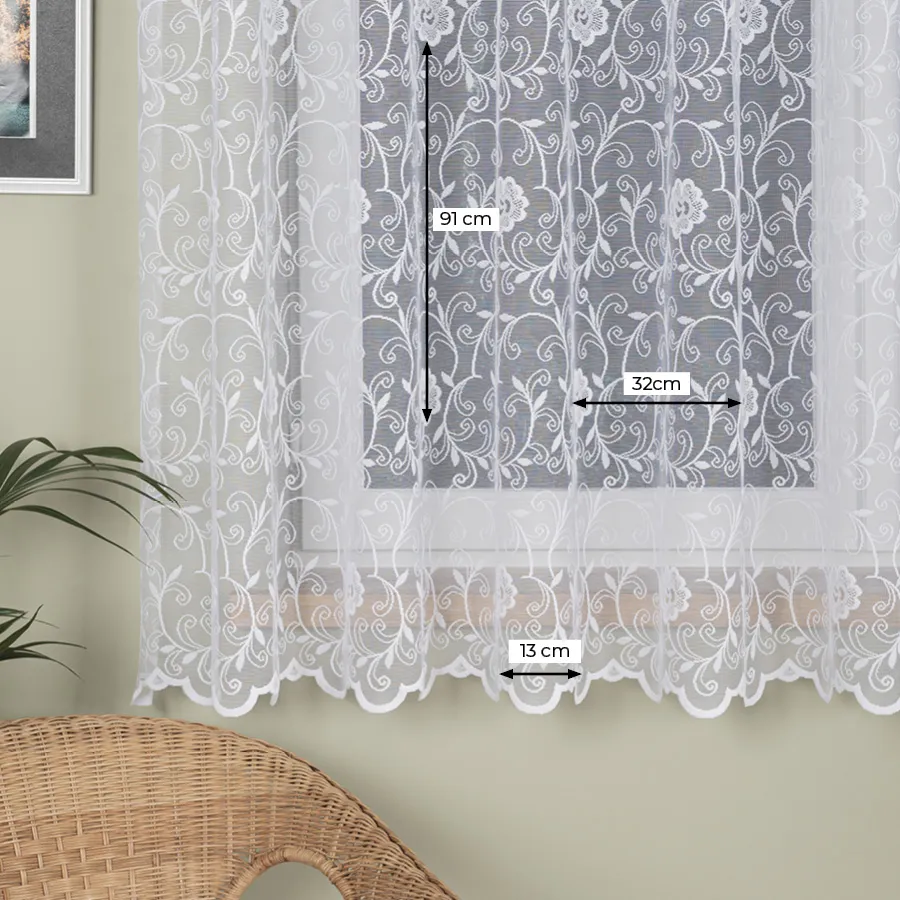 Firanka z delikatnym wzorem kwiatowym po całej powierzchni to idealne rozwiązanie dla osób poszukujących subtelnej dekoracji okiennej.