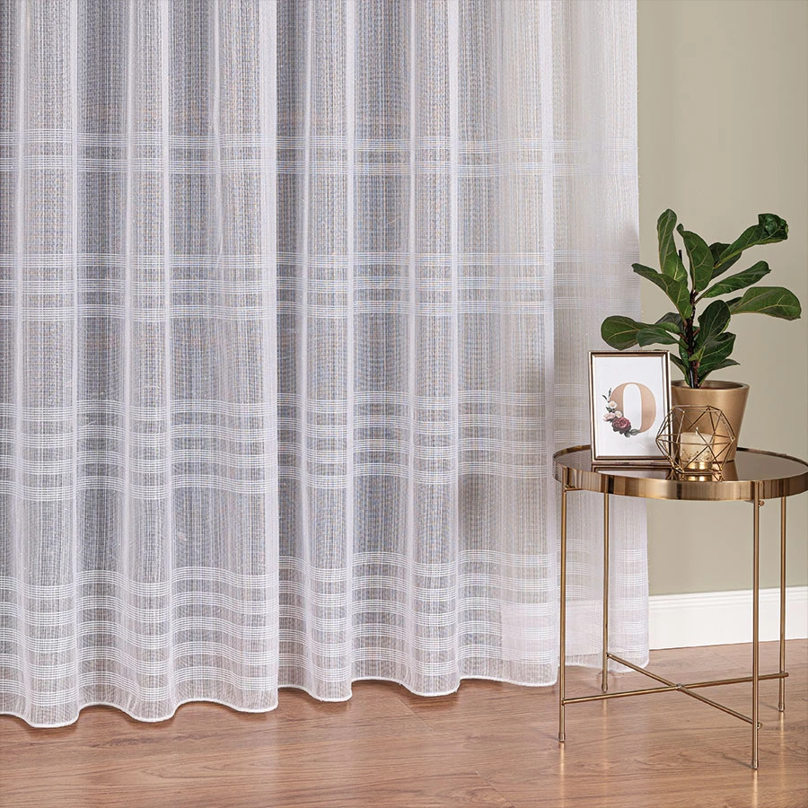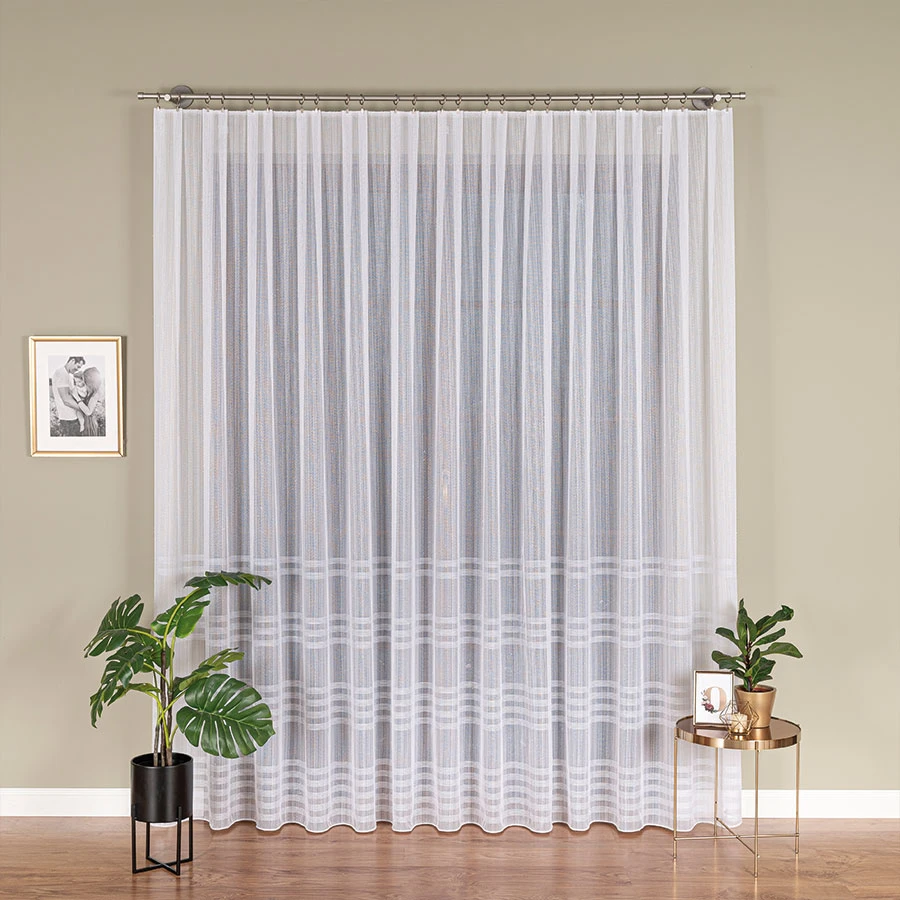 Firanka siatkowa z subtelnym wzorem poziomych pasów to doskonały wybór do nowoczesnych i klasycznych aranżacji. Dzięki bardzo lekkiej strukturze i wysokiej transparentności pozwala na swobodne przenikanie światła, rozjaśniając wnętrze i nadając mu przytulny charakter.