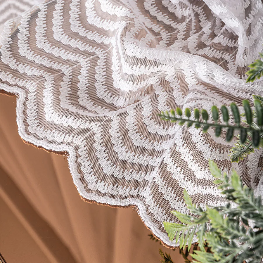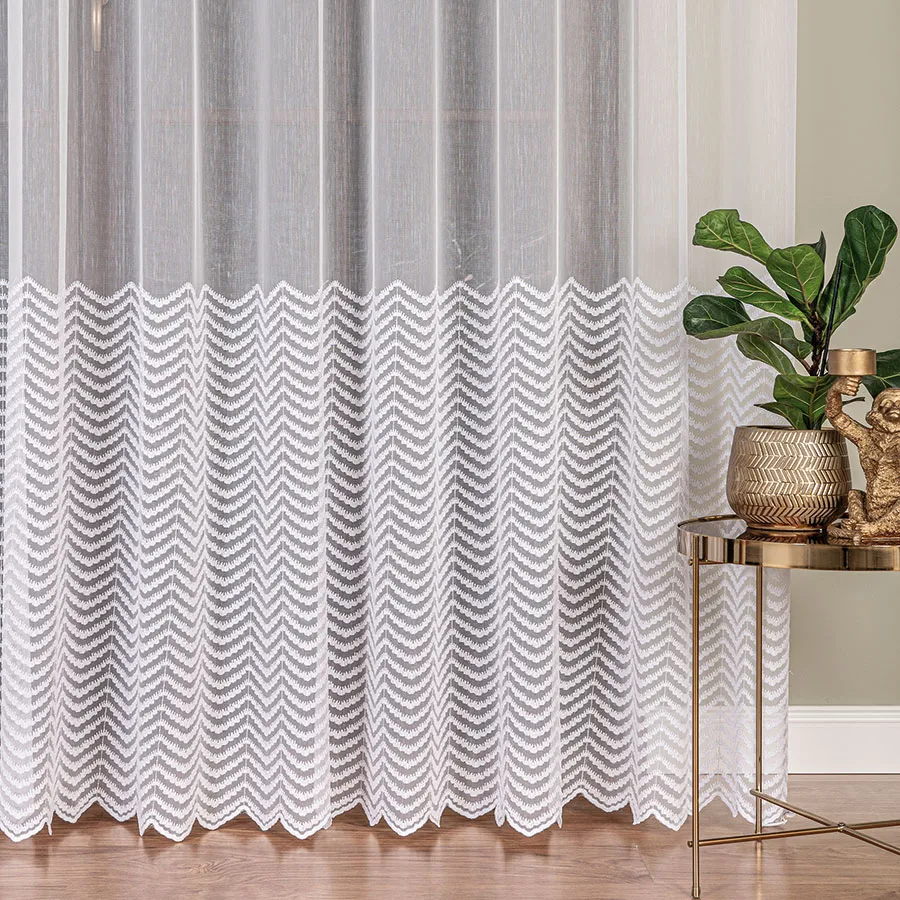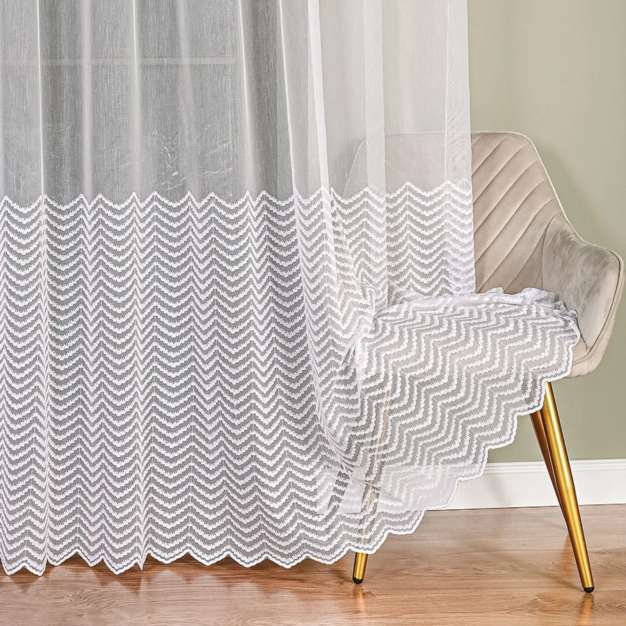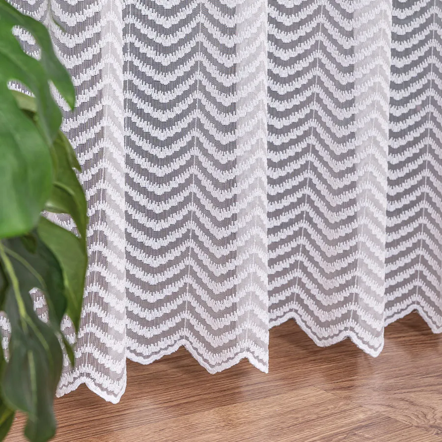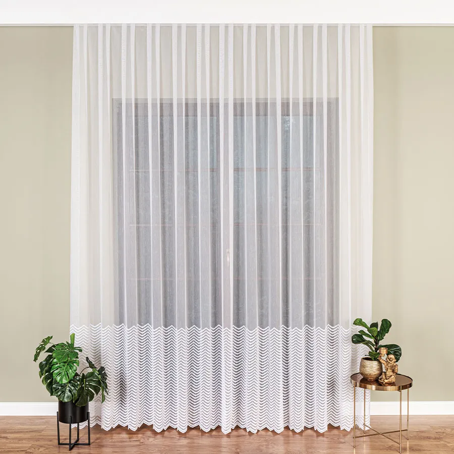 Firanka wykonana z markizety to połączenie nowoczesnego wzornictwa z klasyczną elegancją. Subtelne geometryczne zdobienia u dołu dodają wnętrzu harmonii, a miękka, strukturalna faktura materiału zapewnia piękne układanie się tkaniny.