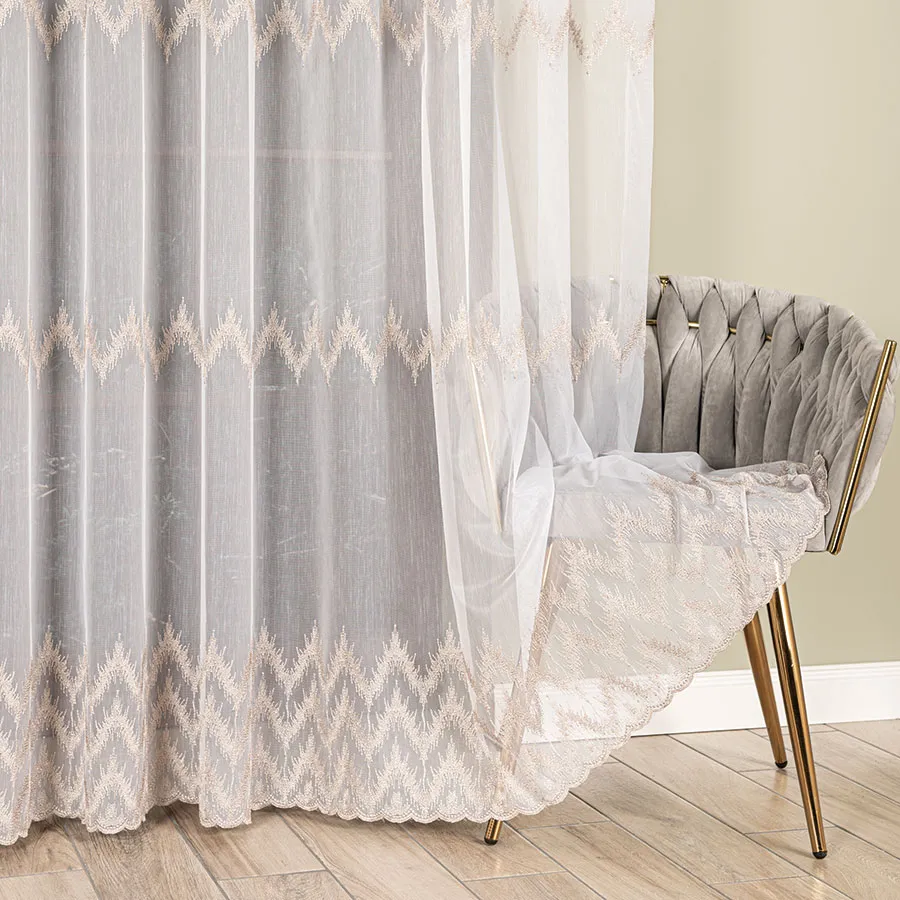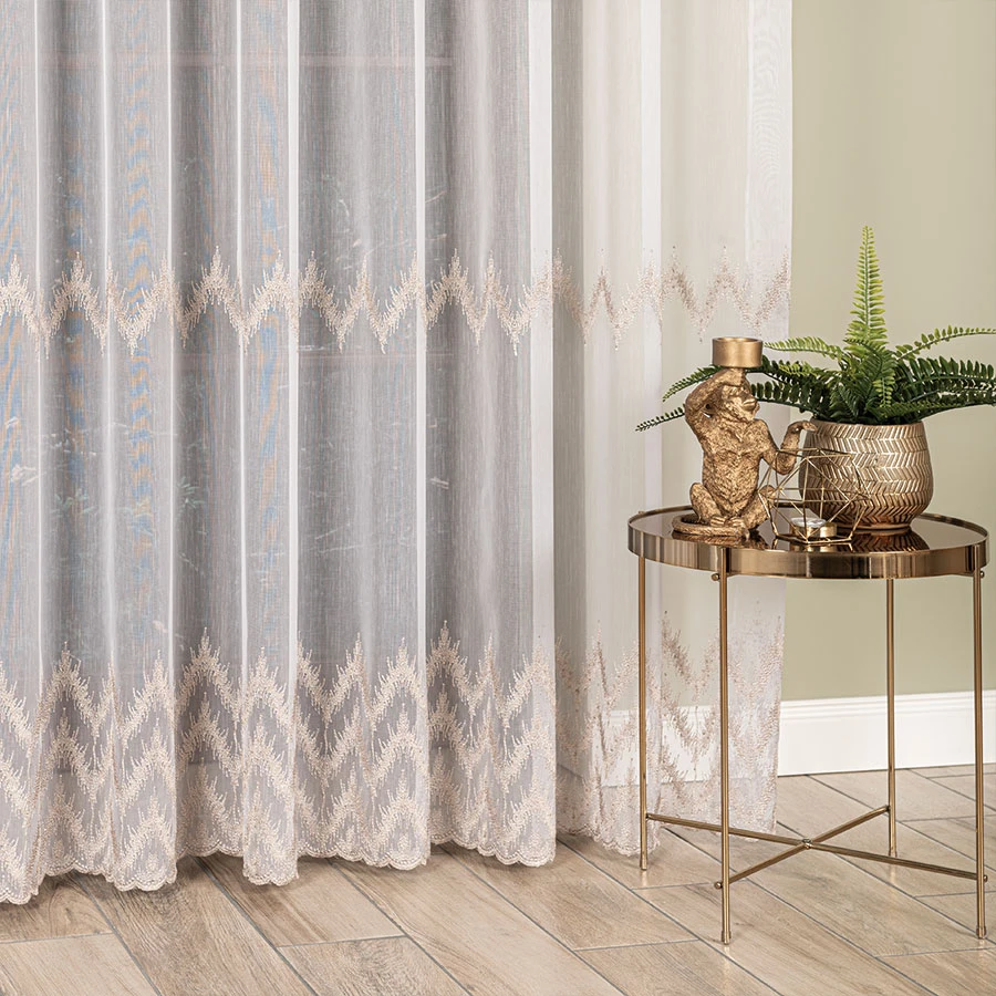 Nadaj swojemu wnętrzu subtelny urok i wyjątkowy charakter dzięki firance z delikatnym haftowanym wzorem. Transparentna, lekka siateczka ozdobiona symetrycznym geometrycznym haftem pięknie prezentuje się zarówno w nowoczesnych, jak i klasycznych aranżacjach.
