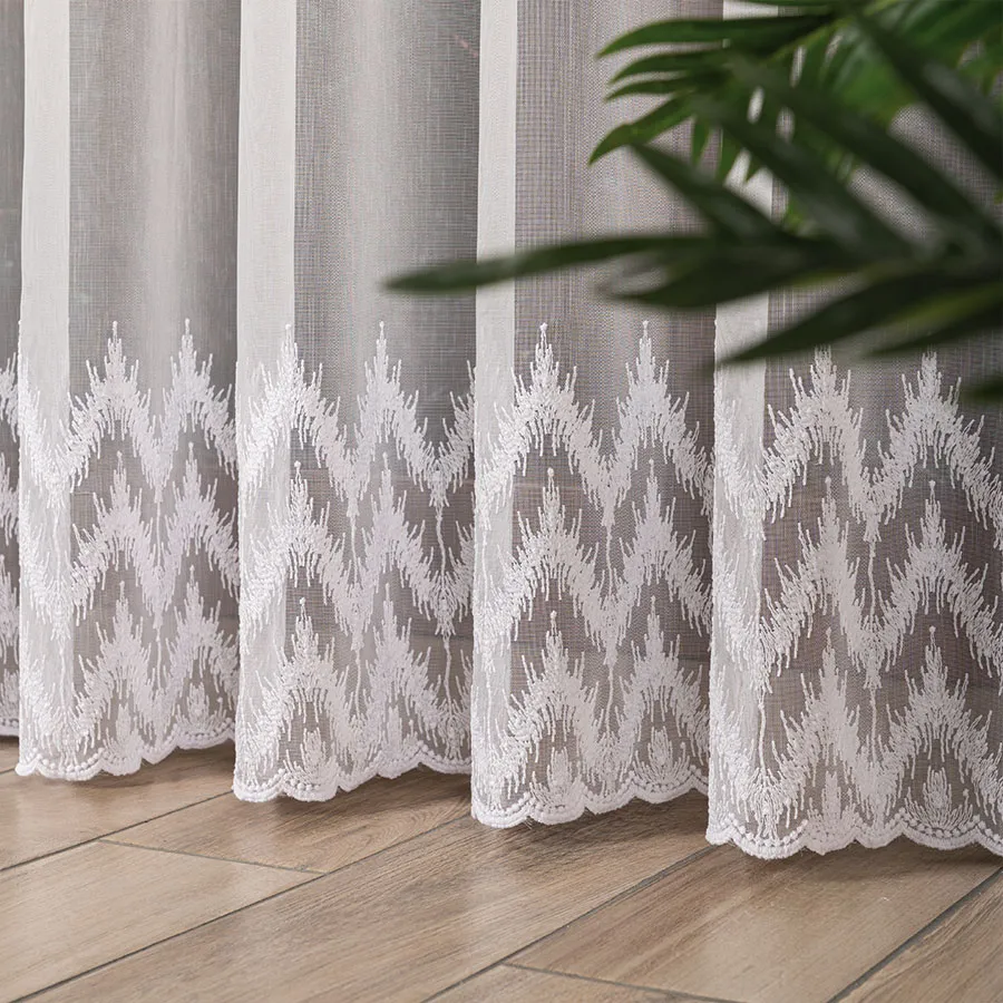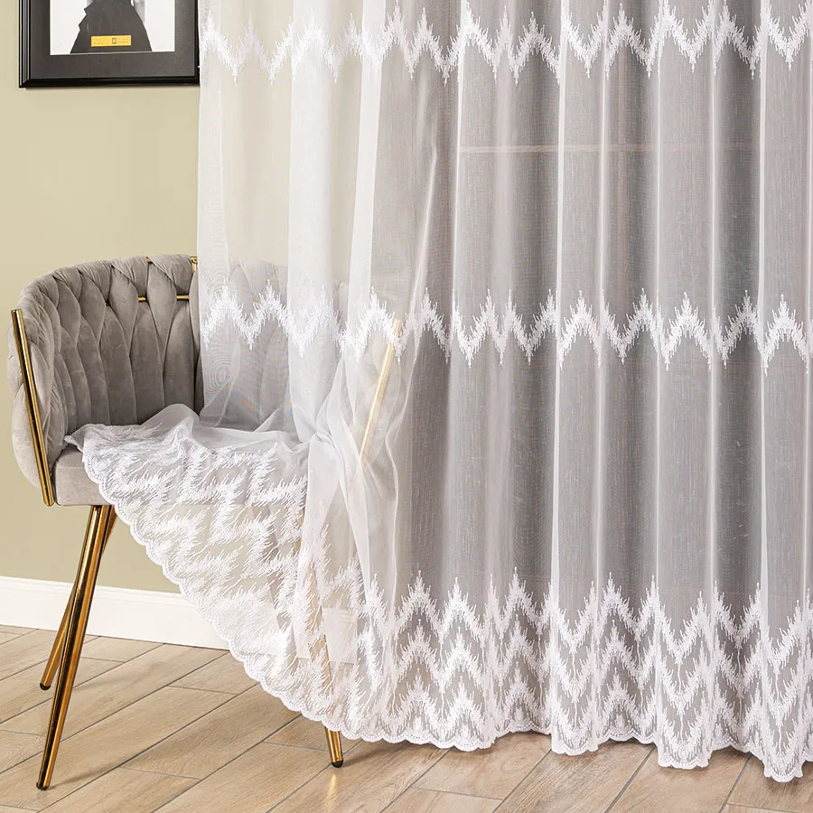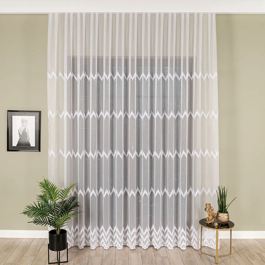 Elegancki haftowany wzór – subtelne, geometryczne zdobienia nadają firance nowoczesny i stylowy wygląd.