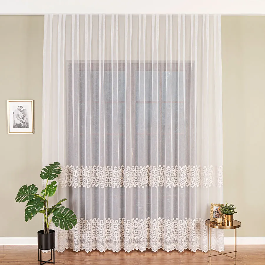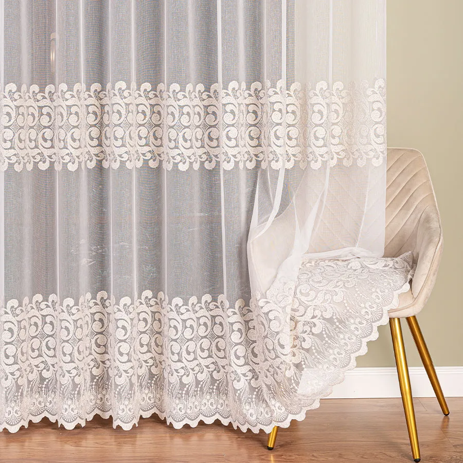 Elegancka firana z markizety, haftowana, lekka i transparentna. Ozdobny dół, miękki chwyt, łatwa w pielęgnacji, idealna do stylowych wnętrz.