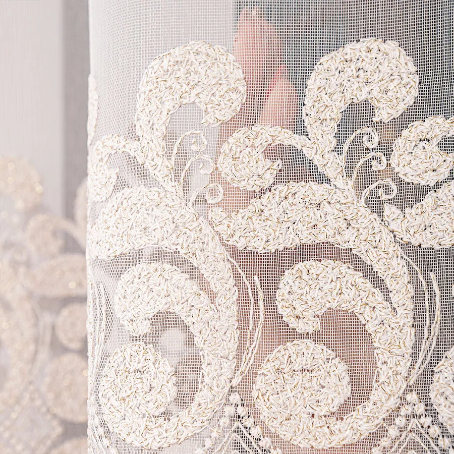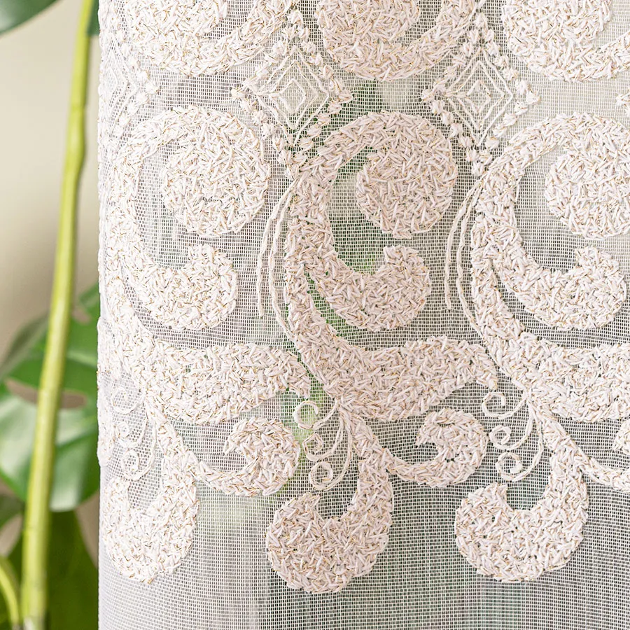 Elegancka firana z markizety z połyskiem to doskonały wybór do wnętrz urządzonych w stylu klasycznym i nowoczesnym. Bogaty, haftowany wzór ornamentowy nadaje jej luksusowego charakteru, podkreślając estetykę i wysoką jakość wykonania.
