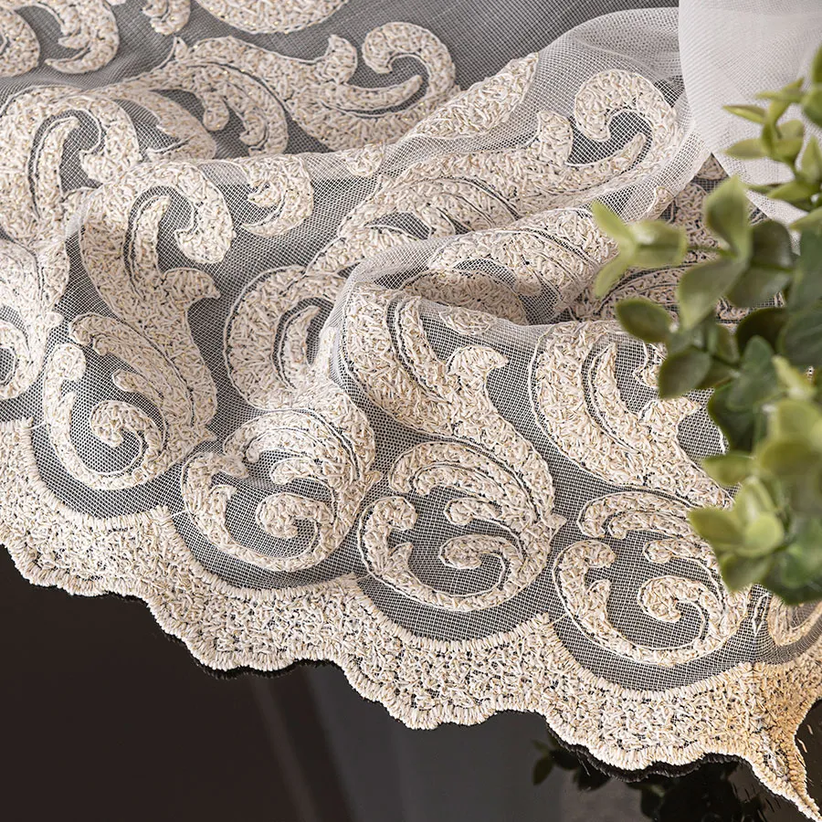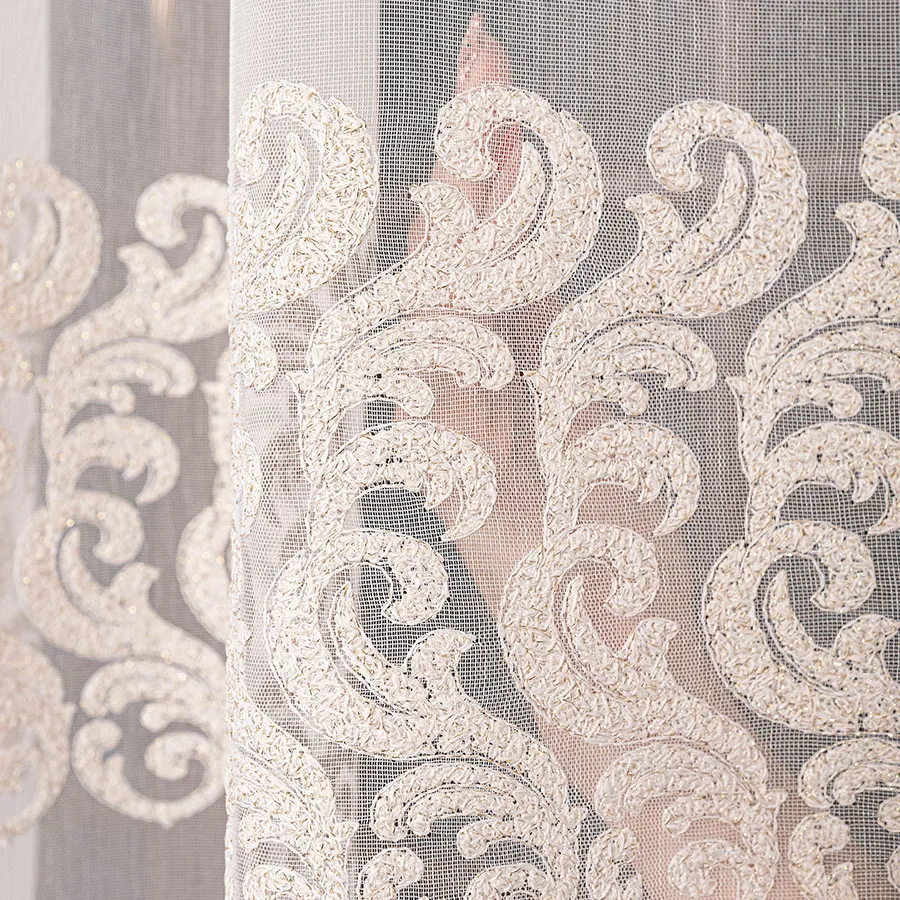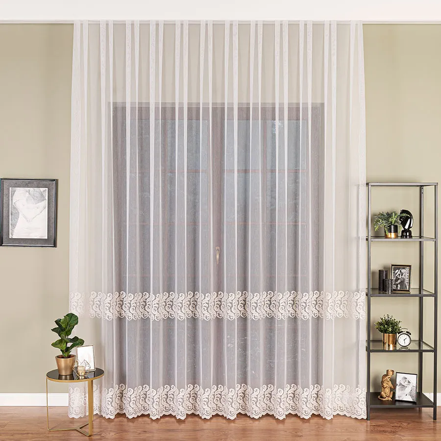 • Haftowane zdobienia – elegancka aplikacja na dole firany podkreśla stylowe wykończenie i dekoracyjny charakter