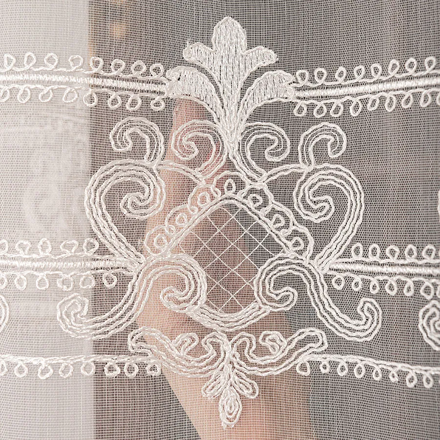 Elegancka firana z markizety z haftowanym zdobieniem, lekka, przepuszczająca światło. Idealna do salonu, sypialni i jadalni, łatwa w pielęgnacji.