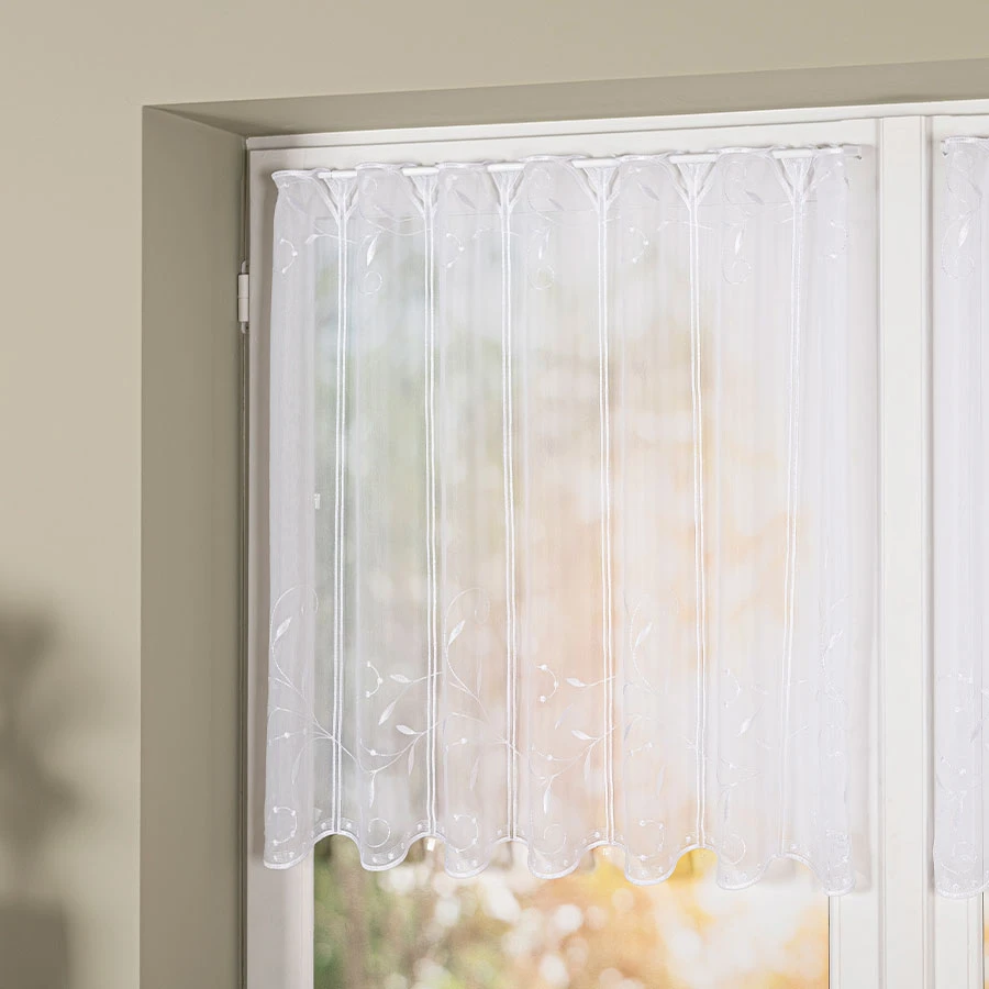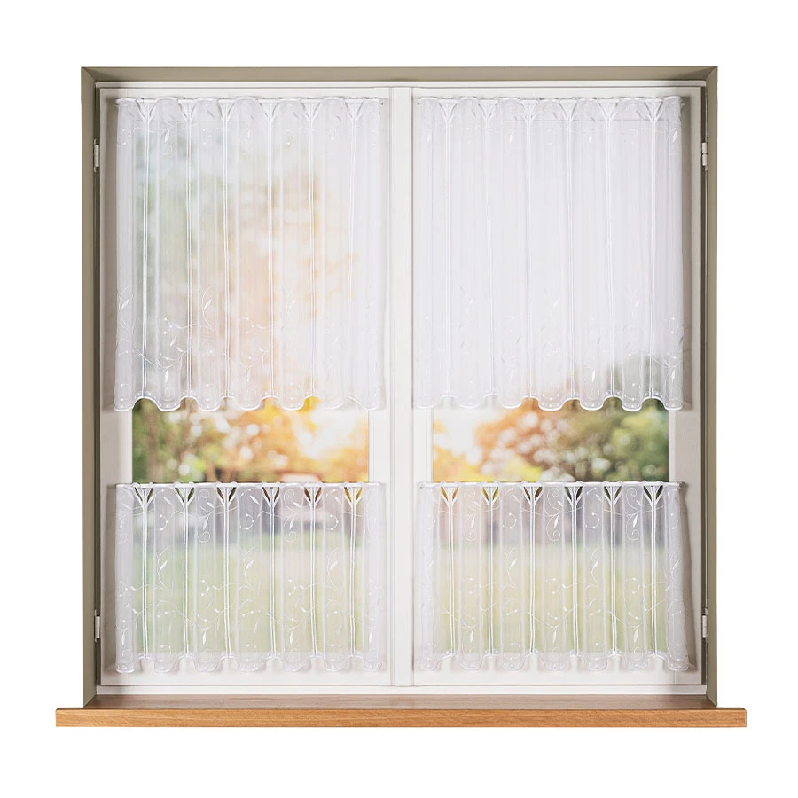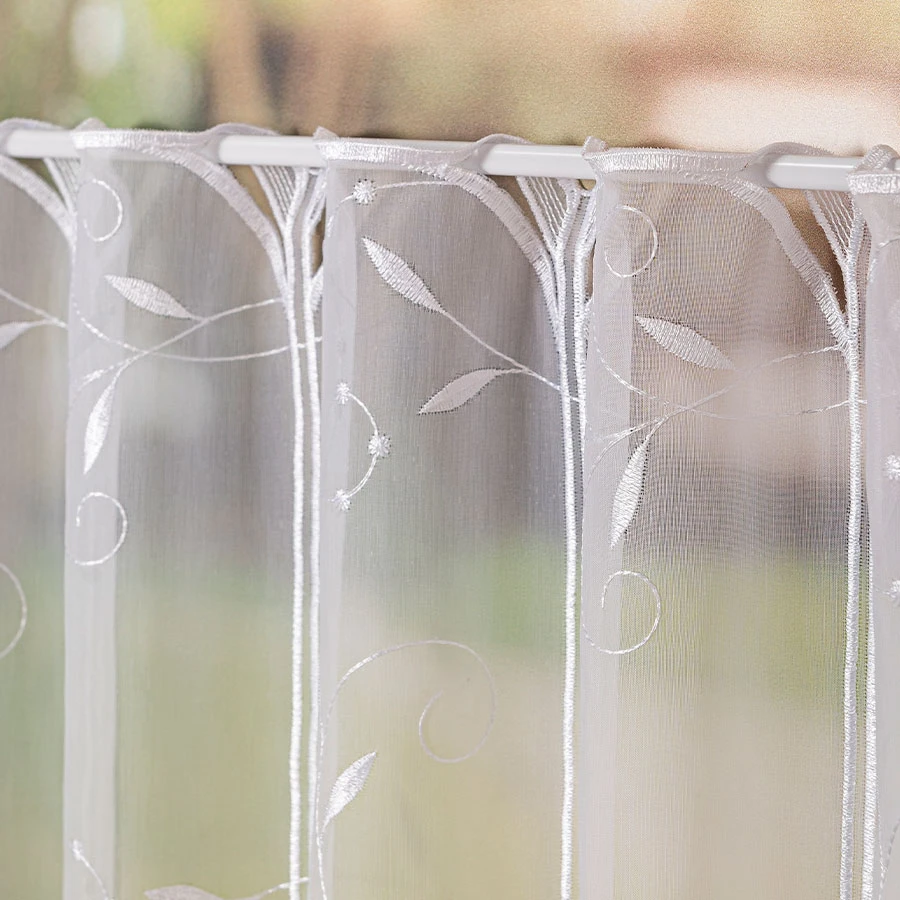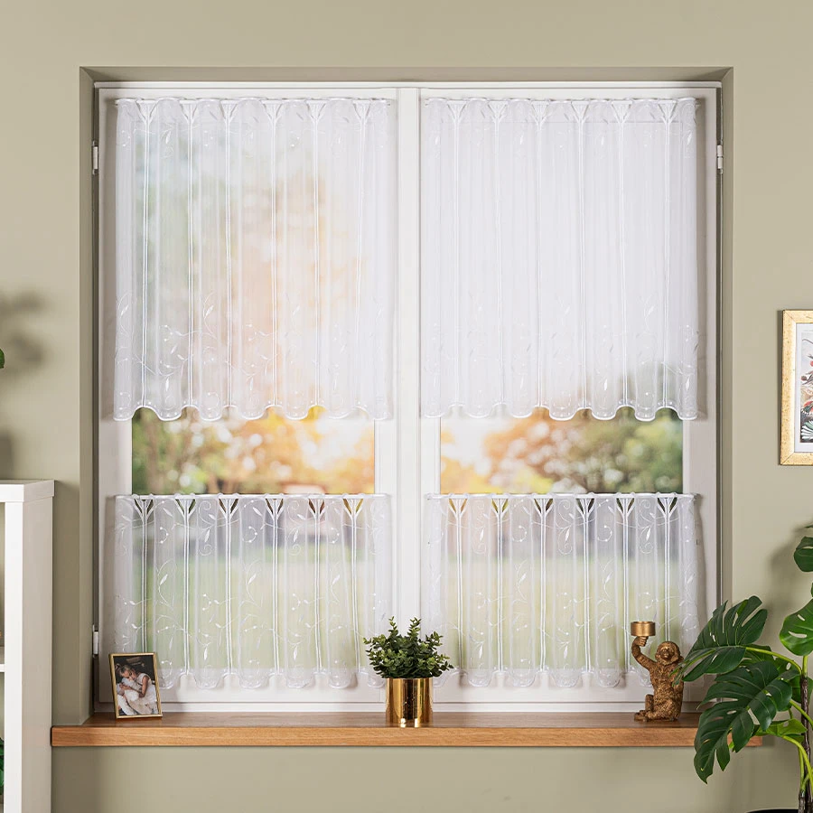 Nadaj swojemu wnętrzu lekkości i naturalnego uroku dzięki zazdrostce haftowanej! Delikatna tkanina woalowa zdobiona subtelnym haftem liści tworzy przytulny klimat, podkreślając elegancję kuchni, jadalni czy rustykalnej aranżacji wnętrza.