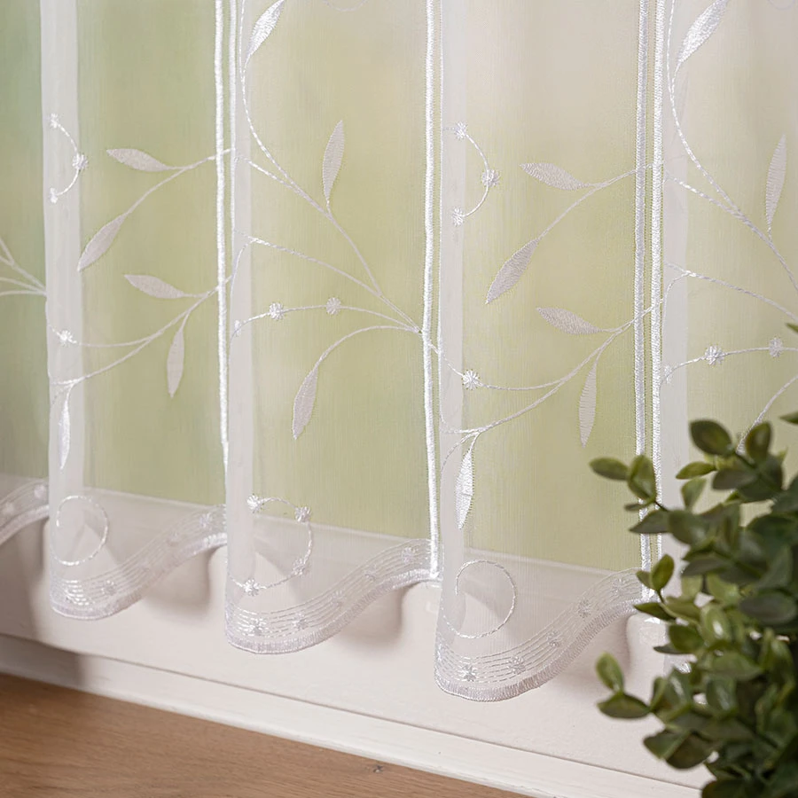 Lekka zazdrostka z woalu ozdobiona subtelnym haftem liści to doskonały wybór do kuchni lub jadalni. Przepuszcza bardzo dużo światła, dodając wnętrzu świeżości i elegancji.