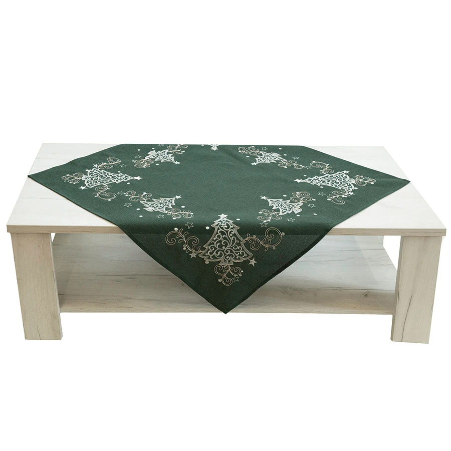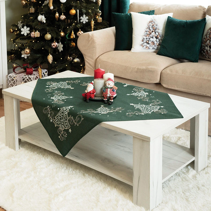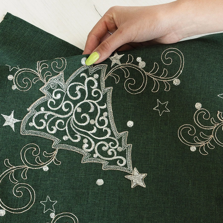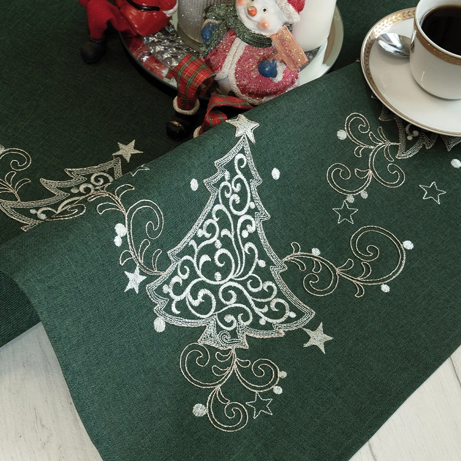 Serweta i obrus dekoracyjny to idealne dodatki świąteczne, które dodadzą elegancji i uroku każdemu stołowi w okresie Bożego Narodzenia. Haftowane błyszczącą nicią choinki nadają im wyjątkowego blasku i świątecznego charakteru.