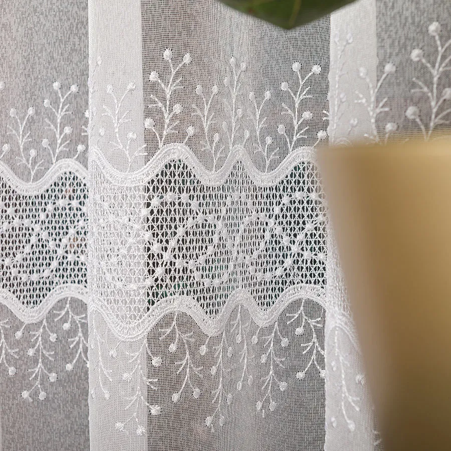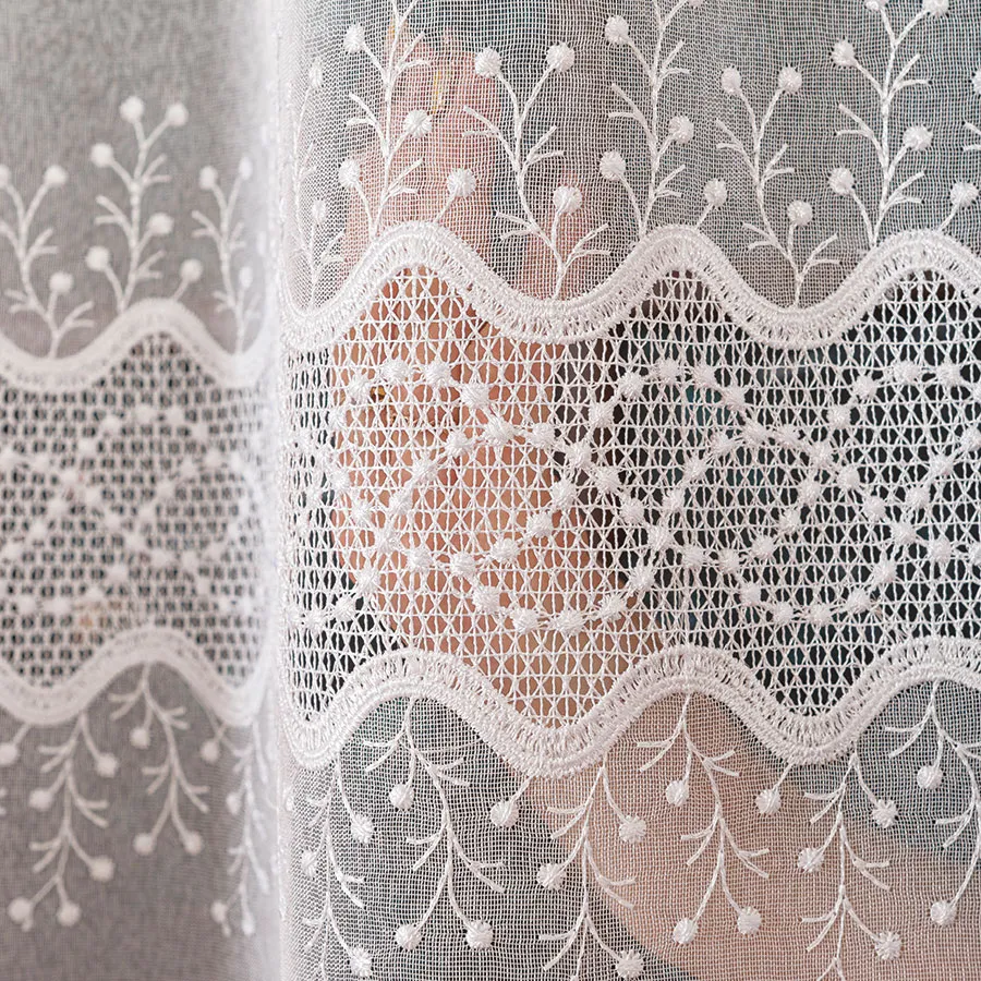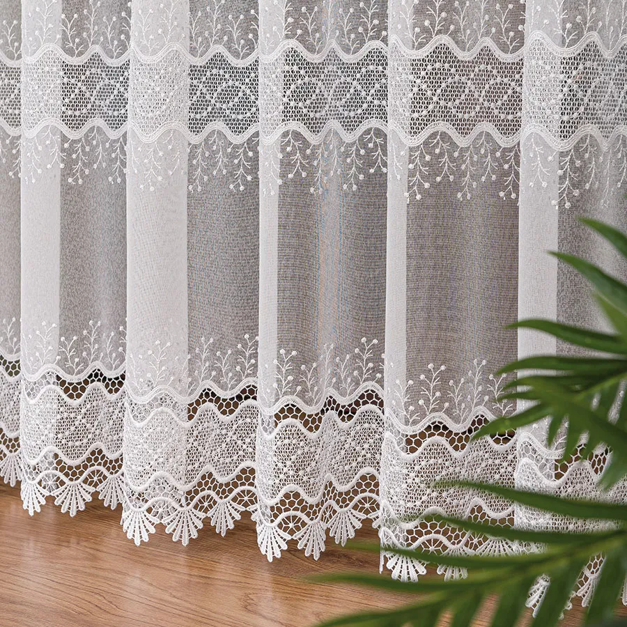Haftowane detale są starannie wykonane i trzymają wysoki standard jakości, co gwarantuje trwałość i estetyczny wygląd firanki przez wiele lat.