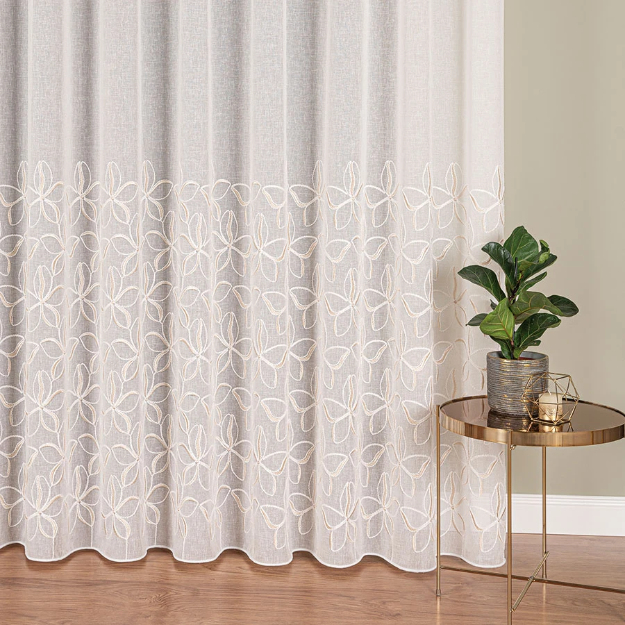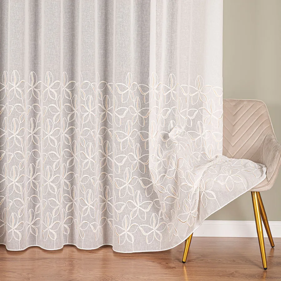 Firanka wykonana z wysokiej jakości materiałów, na których widoczne są piękne hafty, prezentuje się bardzo efektownie. Kwiatowy wzór nadaje jej delikatności i subtelności, dzięki czemu idealnie komponuje się z różnymi stylami aranżacji. Podkład z gęsto tkanej siatki sprawia, że firanka jest trwała i solidna, a dodatkowo przepuszcza jedynie niewielką ilość światła. Dzięki temu zapewnia prywatność, jednocześnie delikatnie rozpraszając naturalne promienie słoneczne. Firanka ładnie się układa, tworząc piękne fałdy i dodając wnętrzu lekkości. Materiał imitujący naturalne włókna sprawia, że firanka wygląda bardzo elegancko i stylowo, a jednocześnie jest łatwa w utrzymaniu czystości. Dostępna w kolorze kremowym, doskonale komponuje się z różnymi kolorami ścian i mebli, dodając wnętrzu przytulności i elegancji. Ta haftowana firanka to doskonały wybór dla osób ceniących sobie wysoką jakość, elegancję i subtelność w swoim domu. Dzięki niej każde wnętrze nabierze wyjątkowego charakteru i uroku.