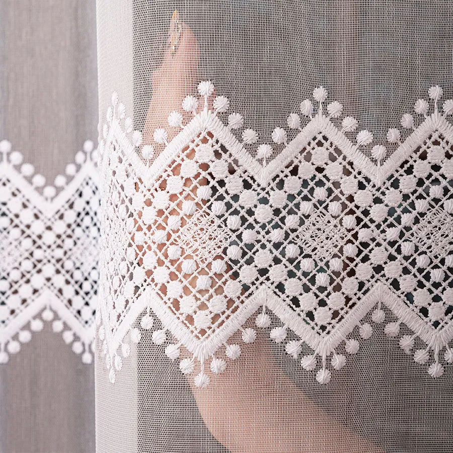 Delikatna markizeta opleciona misternie wykonaną aplikacją w formie rombów tworzy subtelny wzór, który przyciąga uwagę i nadaje wnętrzu wyrafinowanego charakteru.
