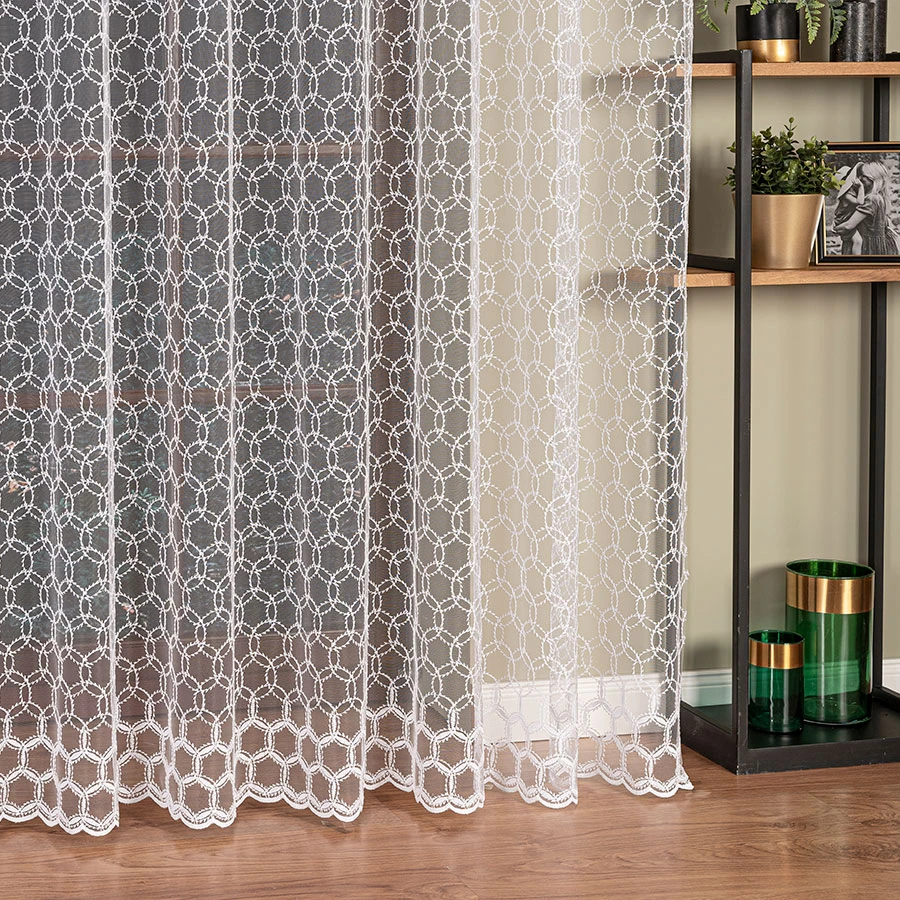 Haftowana firanka na tiulu to elegancki i delikatny dodatek do każdego wnętrza. Jej geometryczne wzory sprawiają, że jest nie tylko praktyczna, ale również piękna i stylowa. Dzięki swojej lekkości i transparentności, firanka przepuszcza dużo naturalnego światła, co sprawia, że pomieszczenie staje się bardziej jasne i przytulne. Materiał tiulu jest lekko sztywny i delikatny w dotyku, co sprawia, że firanka ładnie się układa i pięknie prezentuje na oknie. Haftowane wzory dodają jej dodatkowego uroku i klasy, nadając pomieszczeniu wyjątkowego charakteru. Firanka ta może być świetnym elementem dekoracyjnym w salonie, sypialni czy jadalni, tworząc przyjemną atmosferę i dodając nutkę luksusu. Dzięki wysokiej jakości wykonania, firanka będzie służyć przez wiele lat, zachowując swoje piękno i niezmienny urok.
