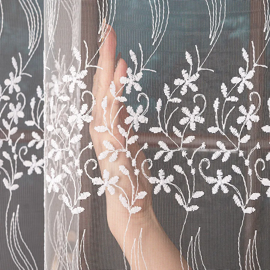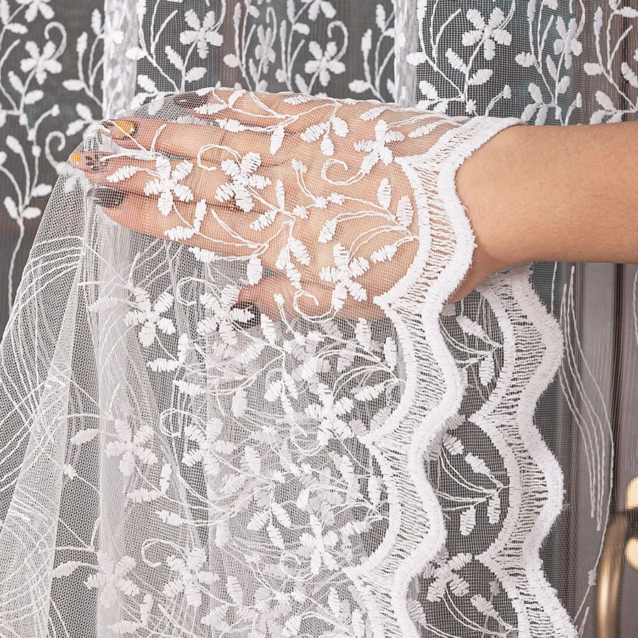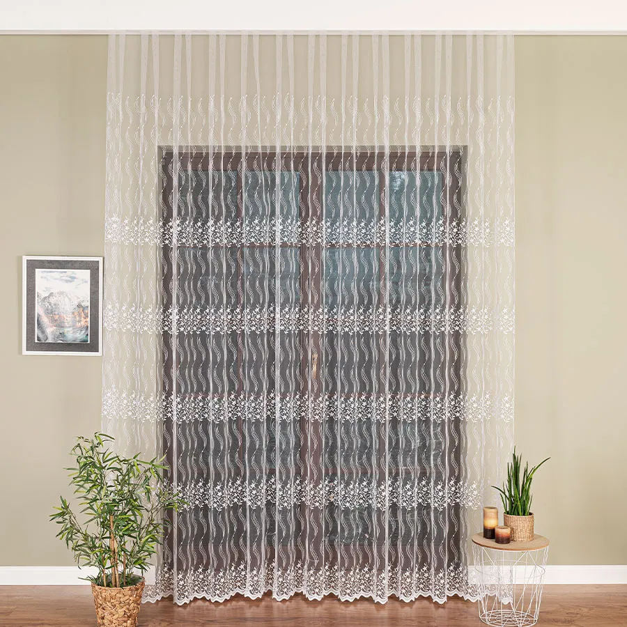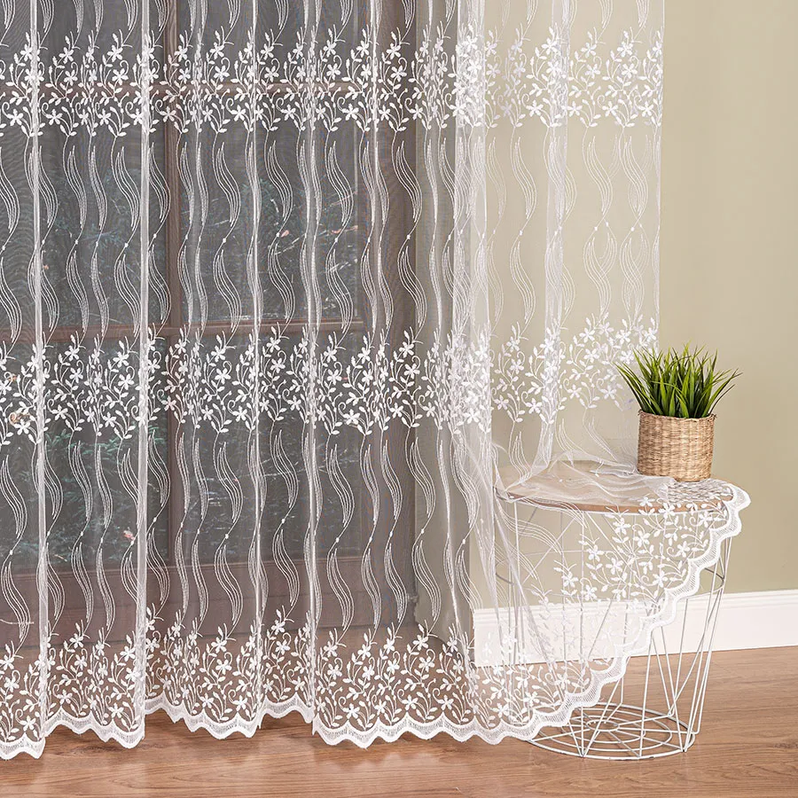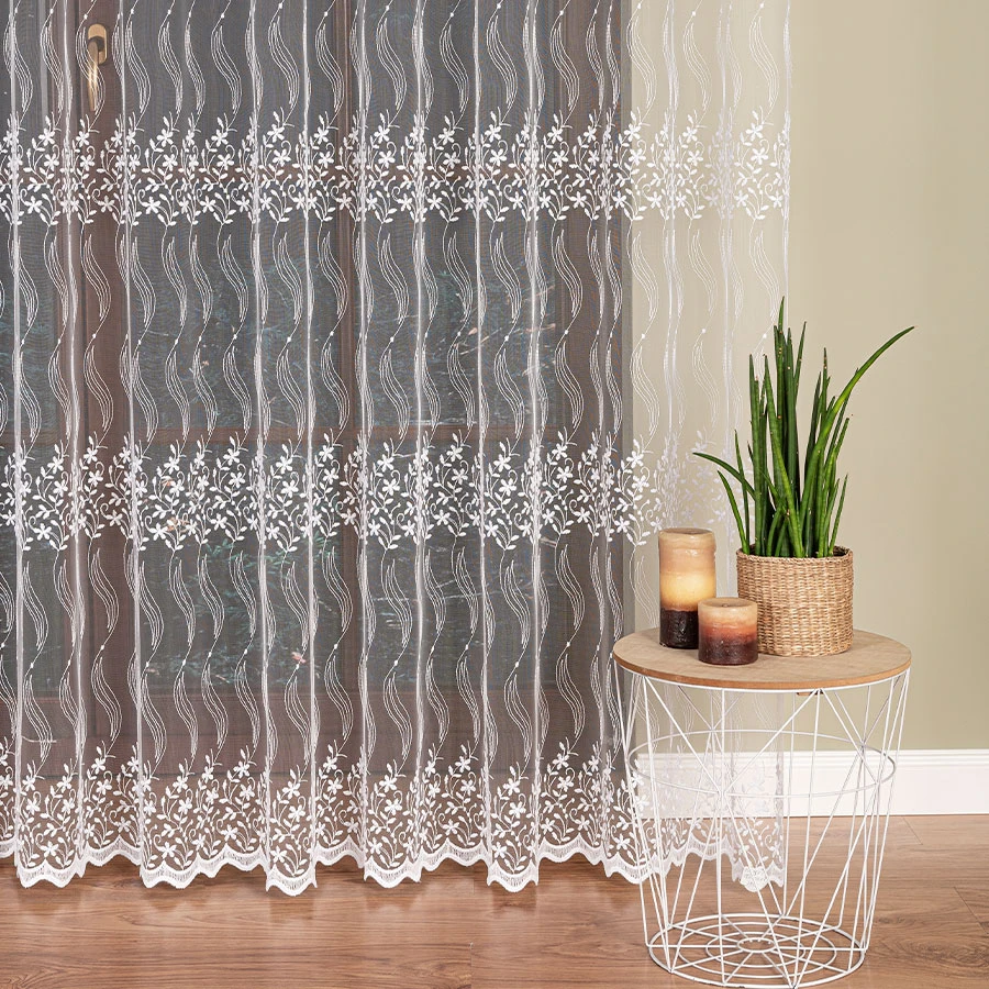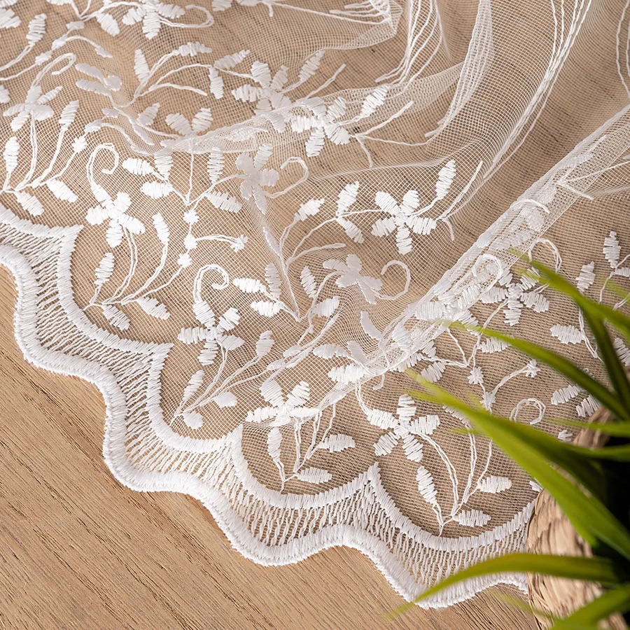 Delikatny haftowany wzór na tiulowym podkładzie sprawia, że firanka prezentuje się wyjątkowo lekko i delikatnie.