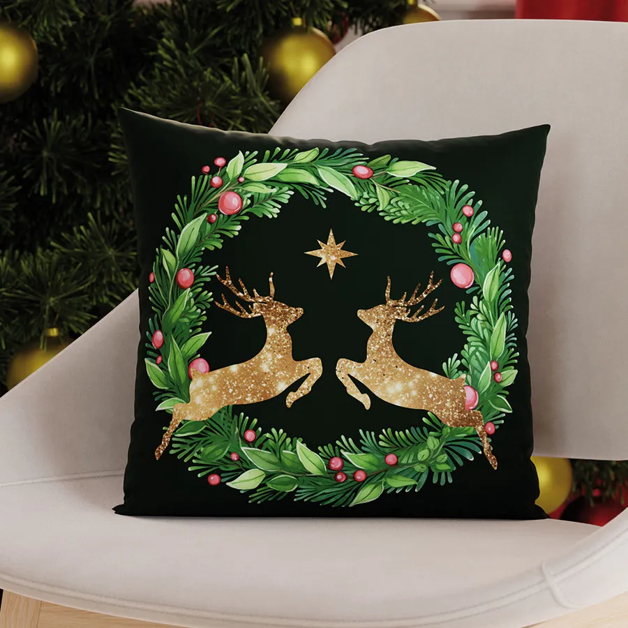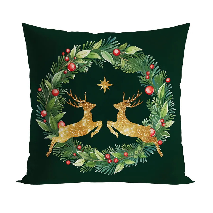 Poduszka dekoracyjna z nadrukiem w postaci jelonków to idealny dodatek do świątecznego wystroju wnętrza. Złote, urocze motywy na tle świątecznego wieńca dodają przytulności i ciepła każdemu pomieszczeniu.