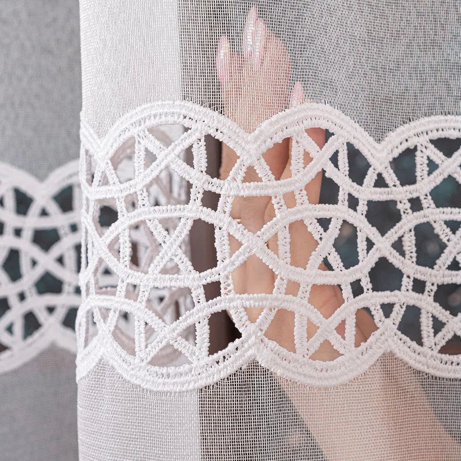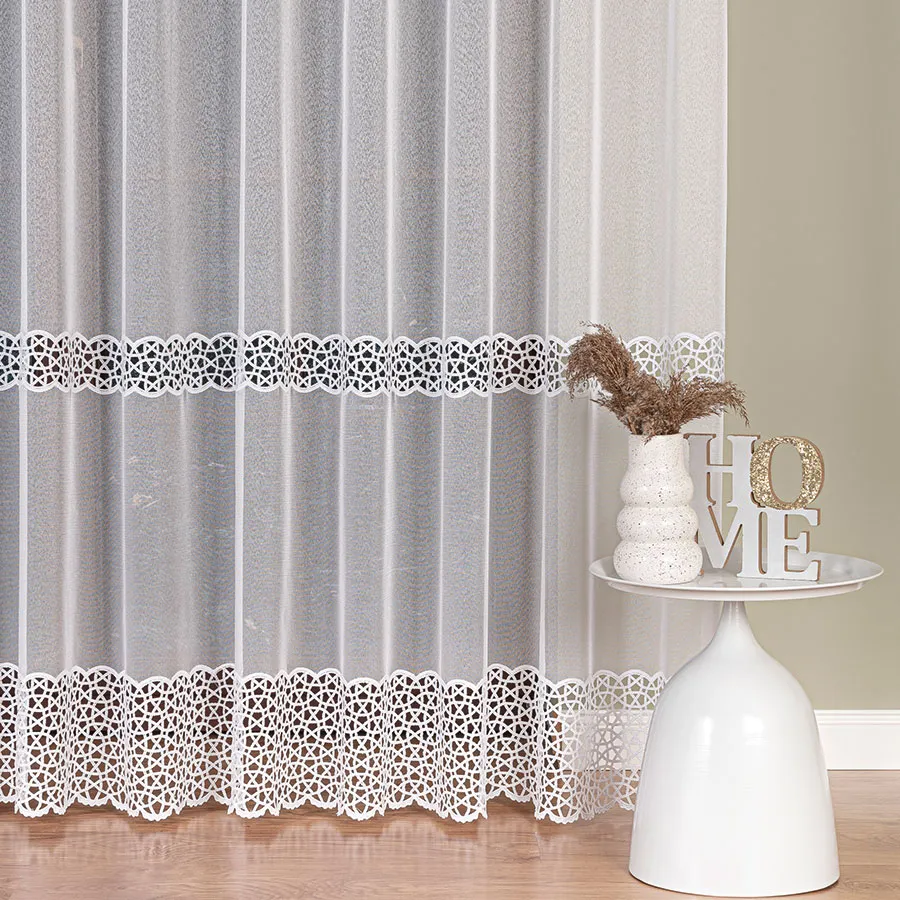Firanka z aplikacją gipiurową doskonale sprawdzi się w salonie, sypialni czy gabinecie, nadając pomieszczeniu wyjątkowego charakteru i atmosfery.