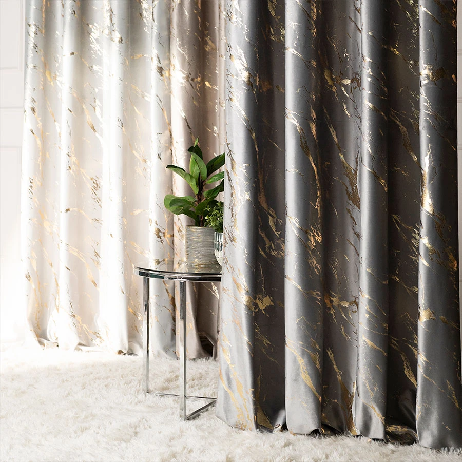 MARMA · Zasłona gotowa na taśmie · 140x250cm · kolor szarobeżowy ze srebrnym nadrukiem
