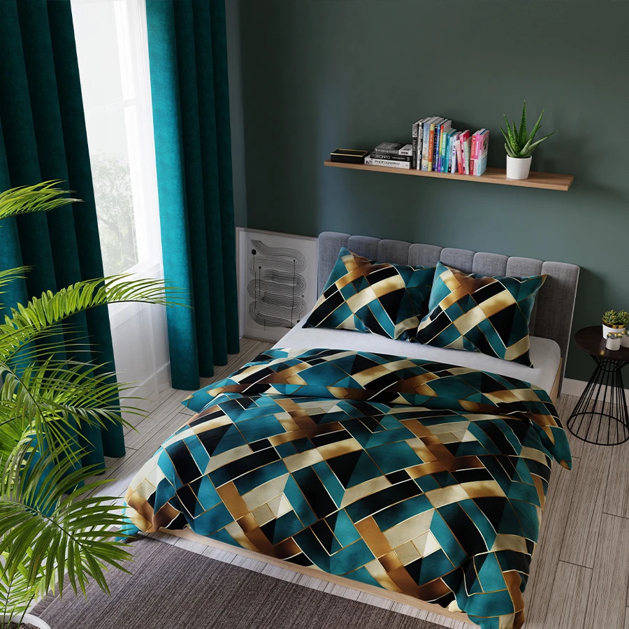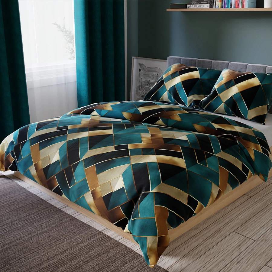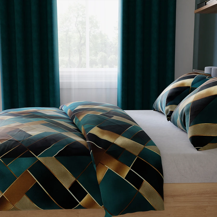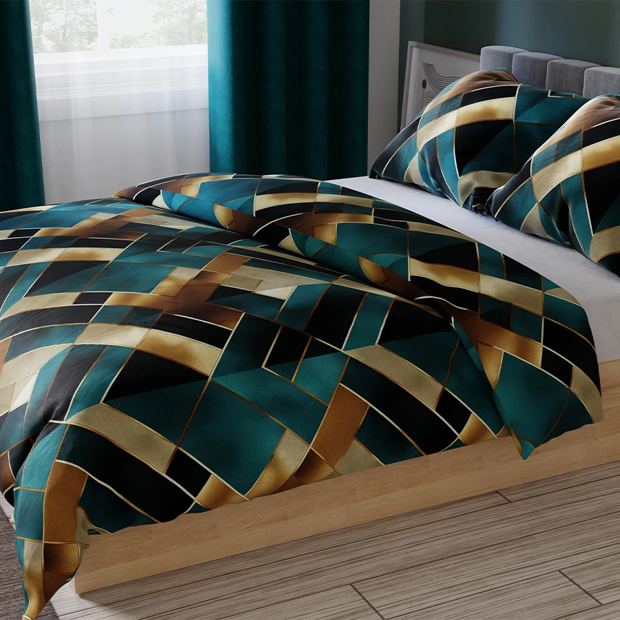 Odkryj harmonię i elegancję w swojej sypialni z pościelą satynową RUBIK. Jej nowoczesny, geometryczny wzór w odcieniach turkusowego i złota tworzy atmosferę luksusu i wyrafinowania. Satynowa bawełna jest niezwykle przyjemna w dotyku, co gwarantuje komfortowy sen każdej nocy.