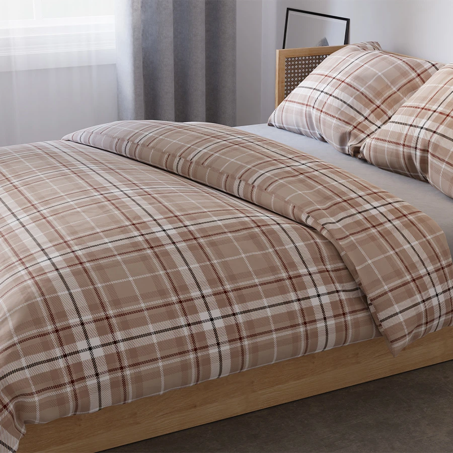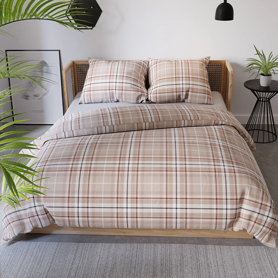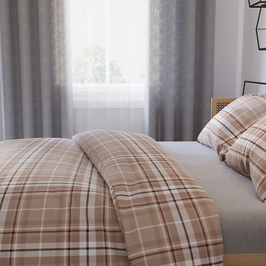 - Klasyczny wzór beżowej kraty 💎 – nadaje sypialni ponadczasowy, elegancki wygląd.