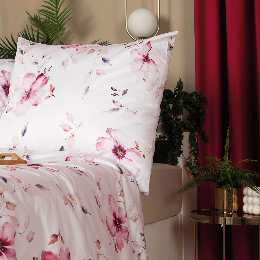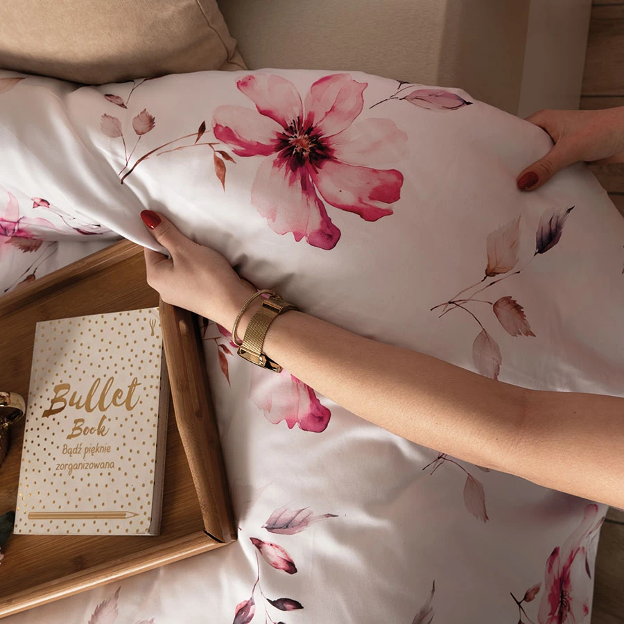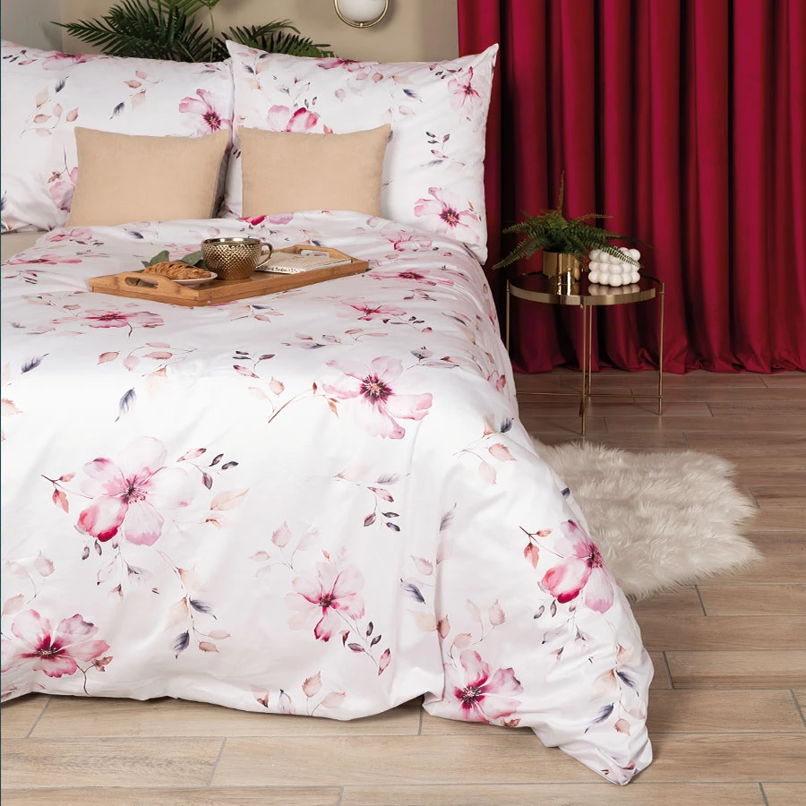Stwórz atmosferę wiosennej lekkości i subtelnej elegancji w swojej sypialni z pościelą KWIAT JABŁONI. Delikatne różowe kwiaty jabłoni na białym tle nadają wnętrzu przytulnego i romantycznego charakteru. Dwustronny nadruk pozwala na szybką zmianę aranżacji, dzięki czemu Twoja sypialnia zawsze wygląda świeżo i stylowo. Pościel doskonale komponuje się ze stylem klasycznym, boho i glamour.