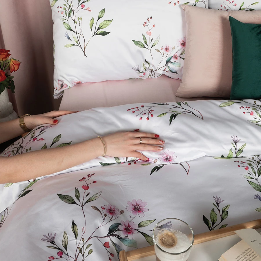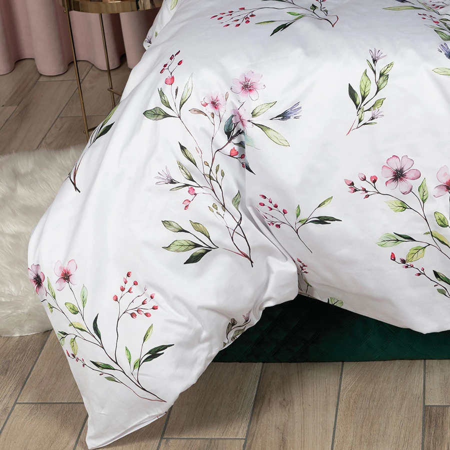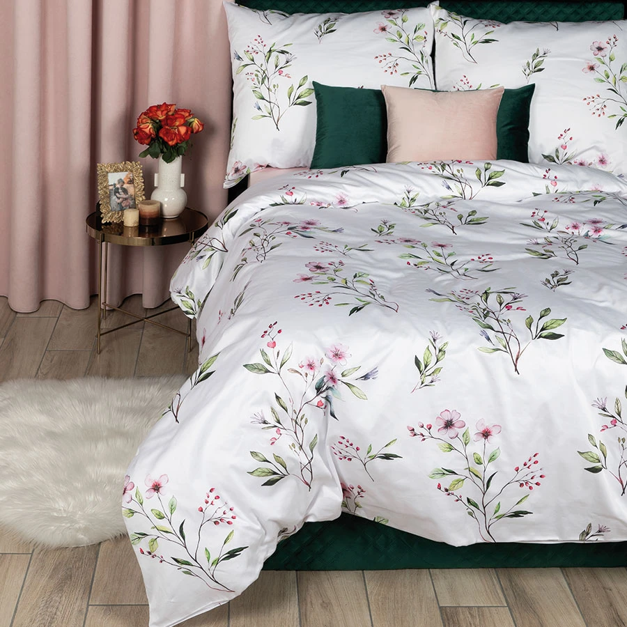 Stwórz w swojej sypialni atmosferę spokoju i delikatności dzięki kompletowi pościeli EDEN. Kwiatowy wzór w pastelowych odcieniach na białym tle wnosi świeżość i naturalność, tworząc przytulne, stylowe wnętrze. Dwustronny nadruk pozwala na łatwą zmianę aranżacji, dostosowując sypialnię do Twojego nastroju. Idealnie komponuje się z wystrojem w stylu skandynawskim, glamour oraz klasycznym.