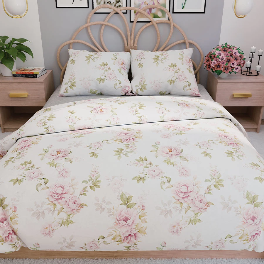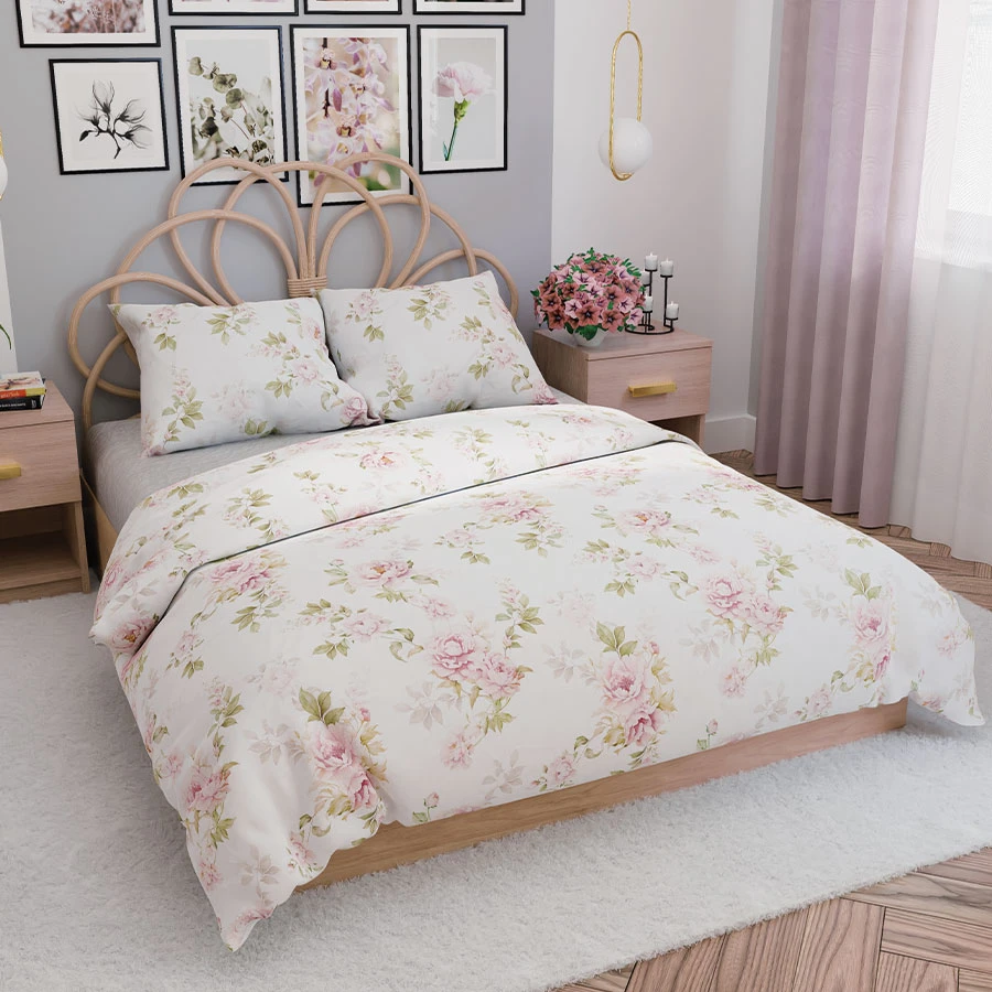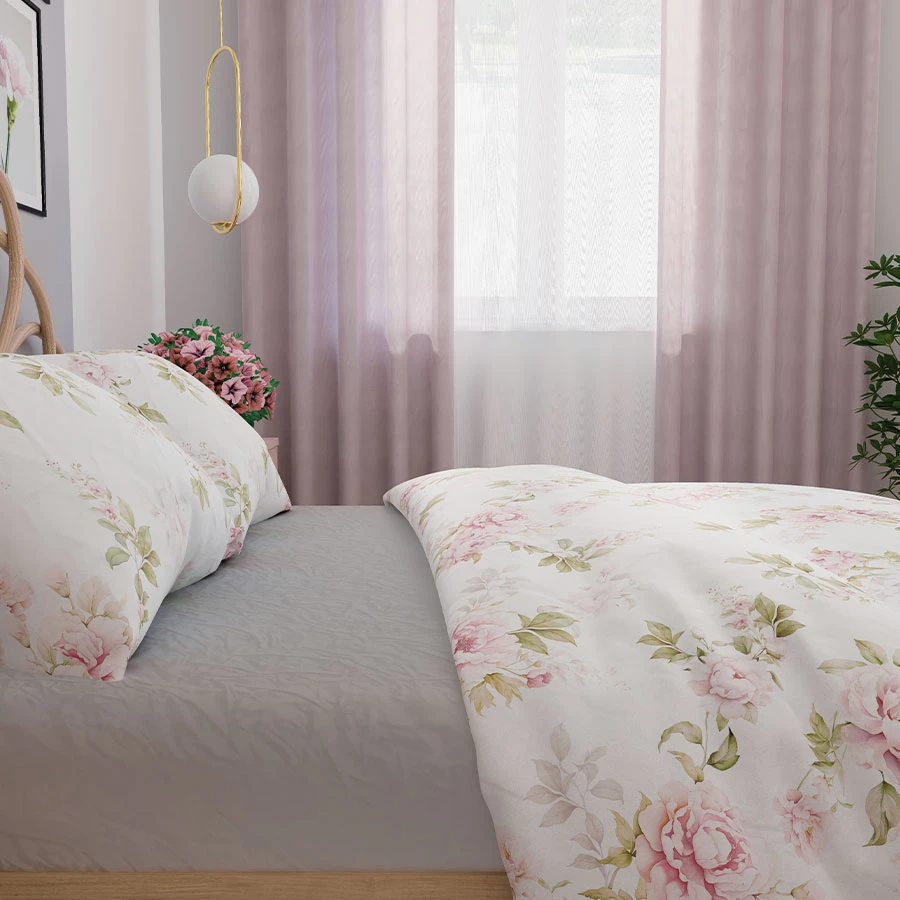 Przenieś się do świata delikatnych, kwiatowych wzorów z kompletem pościeli VALERIA. Subtelne pastelowe kwiaty na jasnym tle dodają wnętrzu lekkości i romantycznego uroku. Ta pościel wprowadza do sypialni atmosferę spokoju i przytulności, idealnie komponując się ze stylem klasycznym, shabby chic czy prowansalskim.