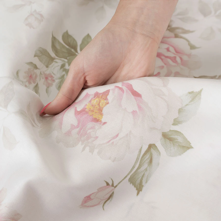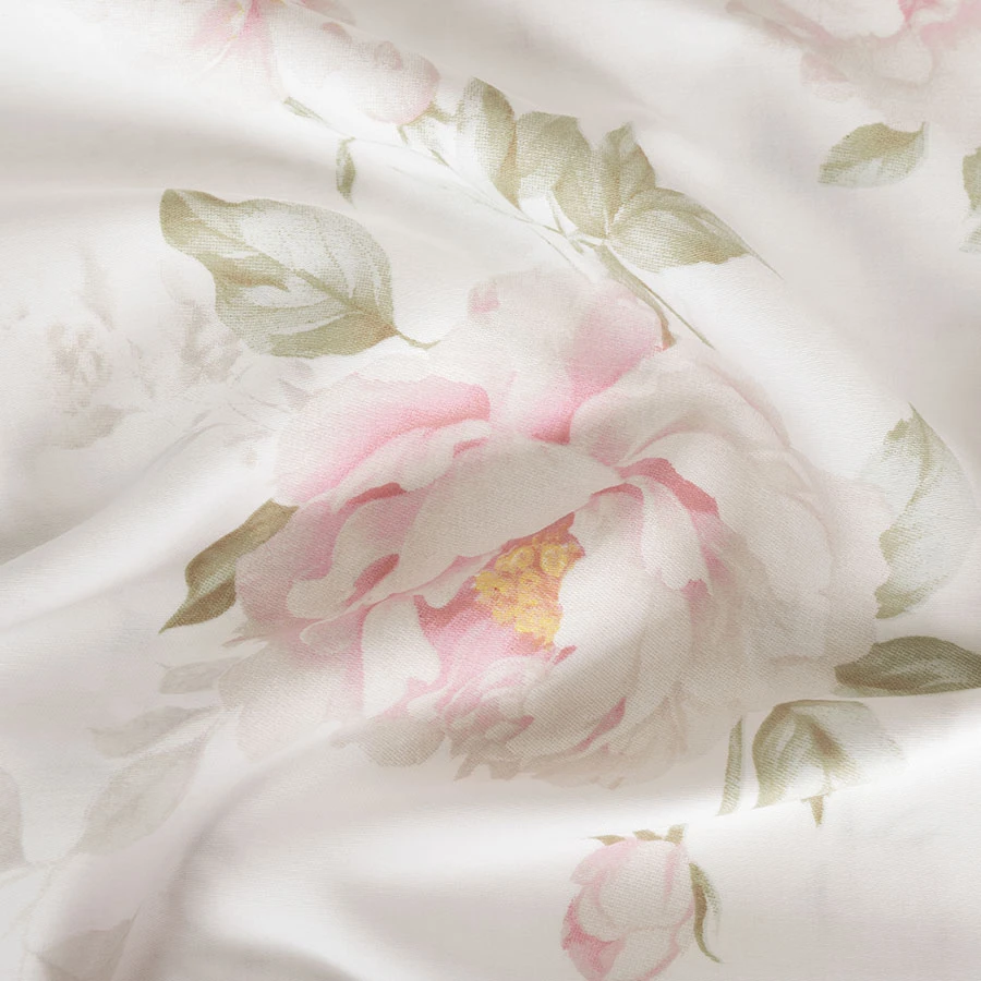 ✔ Romantyczny kwiatowy wzór – subtelne różowe piwonie i zielone liście na jasnym tle.