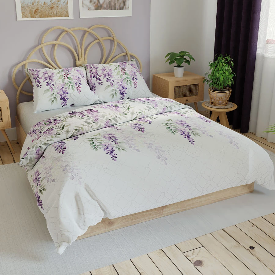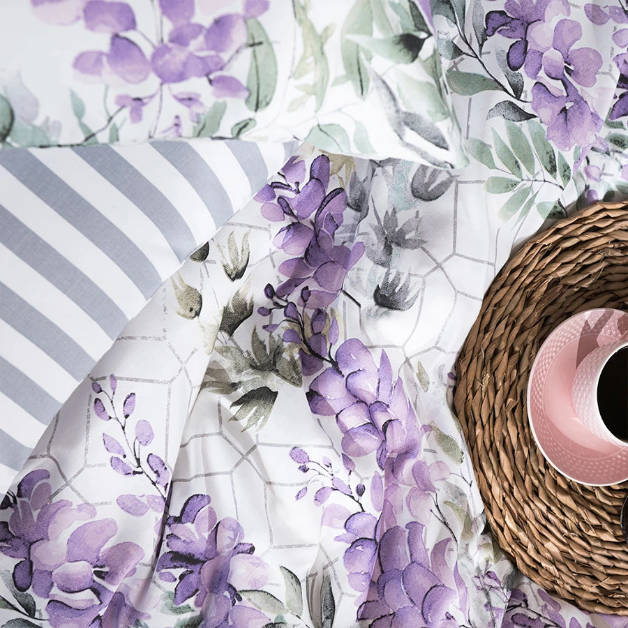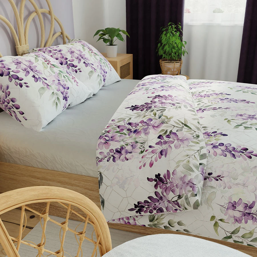 Marzysz o sypialni pełnej harmonii i spokoju? Komplet pościeli LAVANYA to doskonały wybór! Romantyczny kwiatowy wzór w odcieniach fioletu na delikatnym, białym tle dodaje wnętrzu świeżości i lekkości. Ta pościel doskonale komponuje się z aranżacjami w stylu klasycznym, boho, prowansalskim czy skandynawskim, tworząc przytulną atmosferę relaksu.