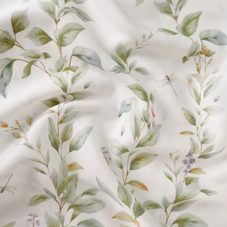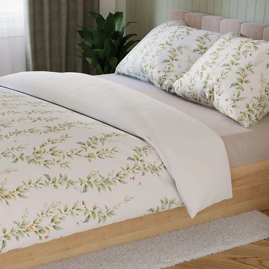Pościel RIMA to wyjątkowe połączenie delikatnego kwiatowego wzoru i pastelowych kolorów, które wprowadzą do Twojej sypialni lekkość, świeżość i romantyczny nastrój. Drobne gałązki i listki na jasnym tle nadają wnętrzu przytulności, doskonale komponując się ze stylem boho, klasycznym i skandynawskim.