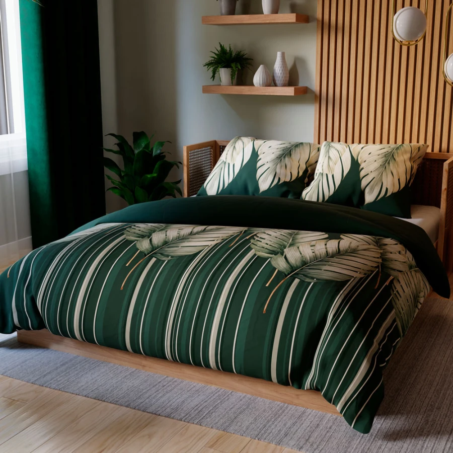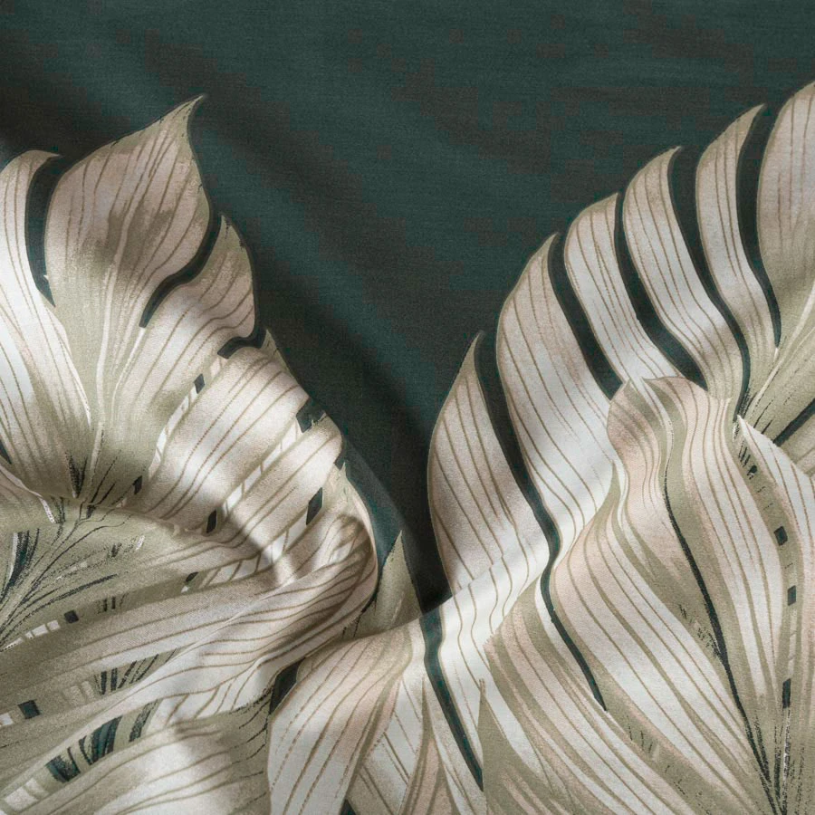 Pościel TROPICANA to odważne połączenie tropikalnego wzoru i intensywnych barw. Butelkowa zieleń tła w połączeniu z realistycznym nadrukiem liści palmy i bananowca wprowadza do wnętrza egzotyczny klimat i harmonię natury. Idealna do nowoczesnych aranżacji, pasuje do stylu urban jungle, boho, glamour i klasycznego.