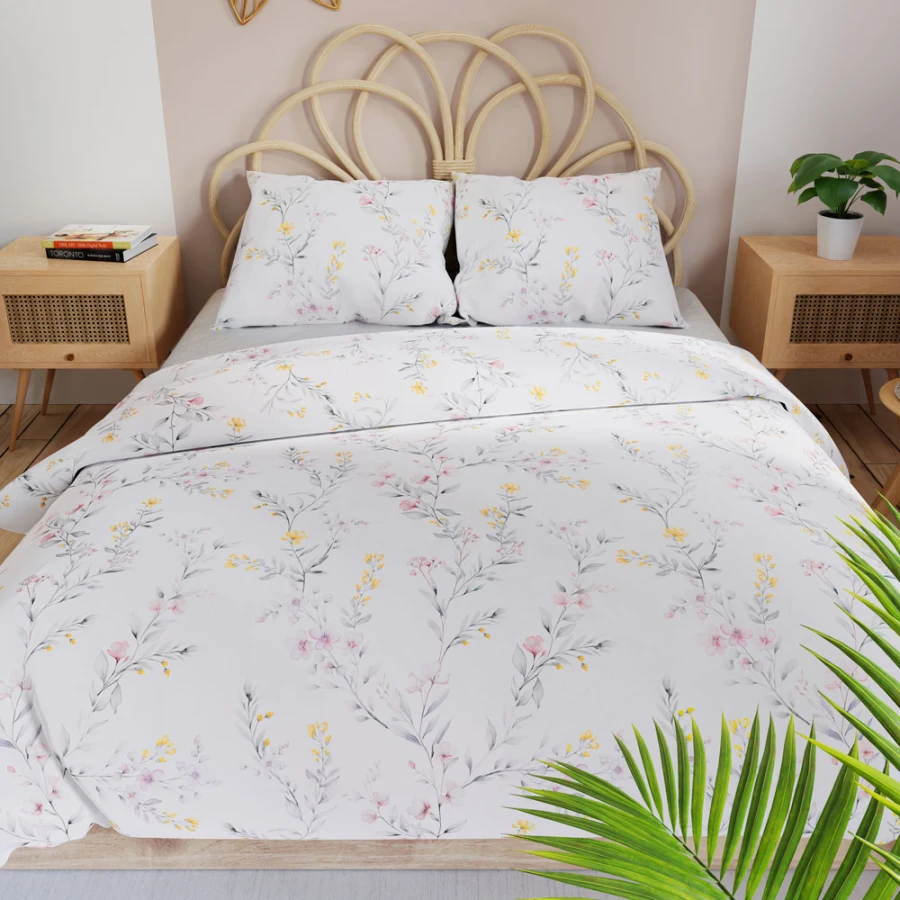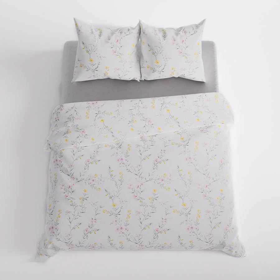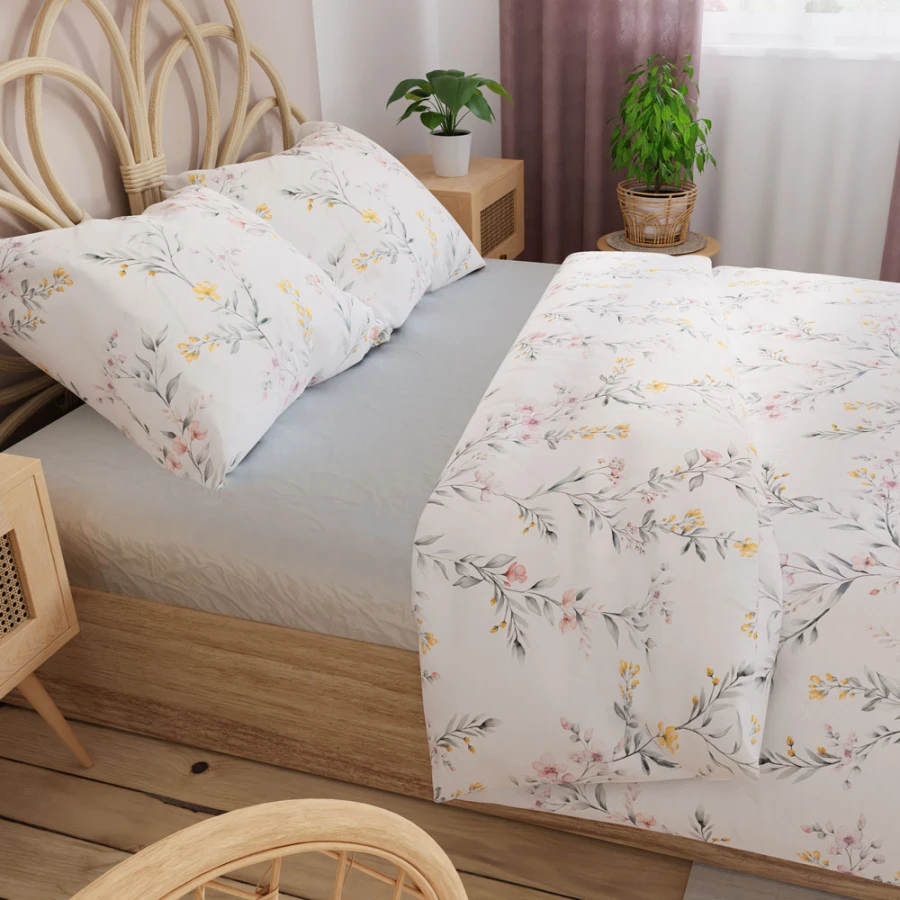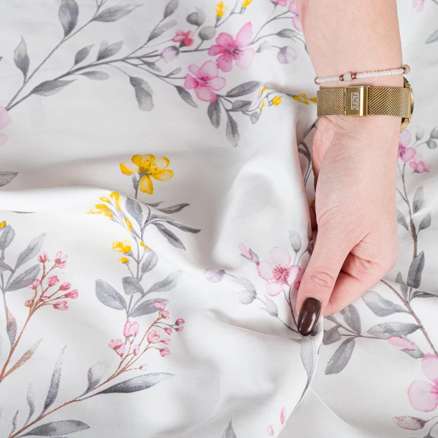 Pościel ZOE to wyjątkowe połączenie delikatności i subtelnego designu. Jasne tło zdobi pastelowy wzór kwitnących gałązek, który nadaje wnętrzu świeżości, lekkości i romantycznego uroku. Idealnie wpisuje się w aranżacje w stylu boho, skandynawskim, klasycznym i rustykalnym, tworząc ciepłą i przytulną atmosferę.