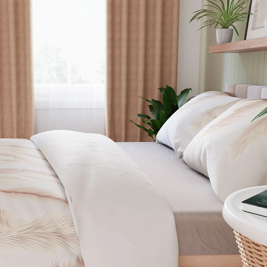 Pościel INDINA to esencja naturalnego piękna i delikatności. Jej biała baza ozdobiona subtelnym wzorem traw pampasowych w beżowych odcieniach tworzy wyjątkową atmosferę spokoju i harmonii. Idealna do wnętrz w stylu boho, skandynawskim, rustykalnym i minimalistycznym, w których królują jasne barwy i naturalne akcenty.