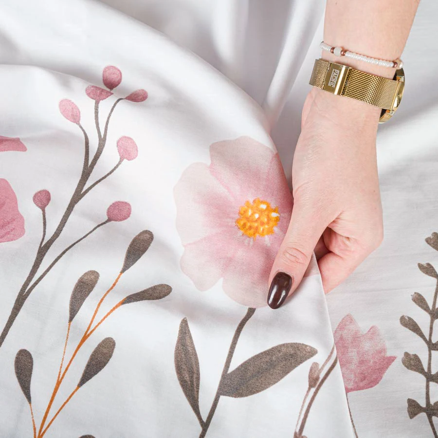 Bawełna satynowa wyróżnia się delikatnym połyskiem i jedwabistą miękkością, dzięki czemu wygląda elegancko, a sen staje się jeszcze bardziej przyjemny. Przewiewna tkanina zapewnia komfort przez cały rok, dopasowując się do temperatury ciała.