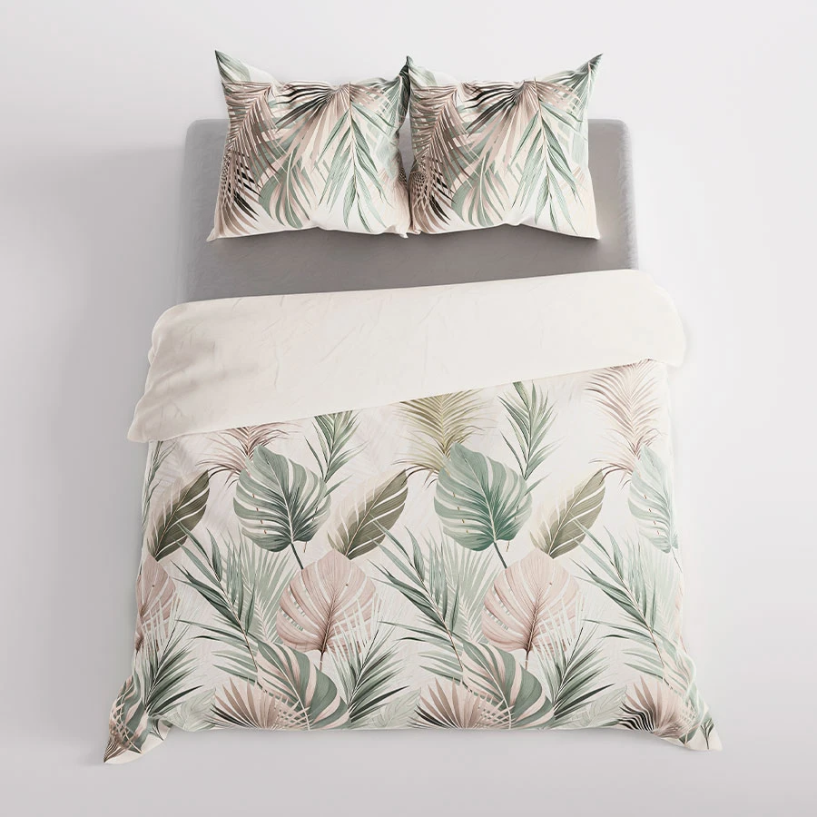 Pościel LUSH to propozycja dla miłośników naturalnych motywów i subtelnych, eleganckich wnętrz. Delikatne liście palmowe w odcieniach zieleni, beżu i pastelowego różu tworzą kompozycję inspirowaną egzotyczną przyrodą. To doskonały wybór do sypialni w stylu boho, skandynawskim, nowoczesnym i urban jungle.