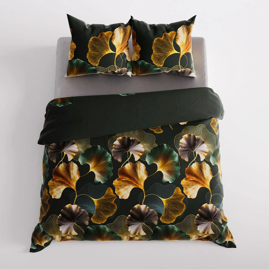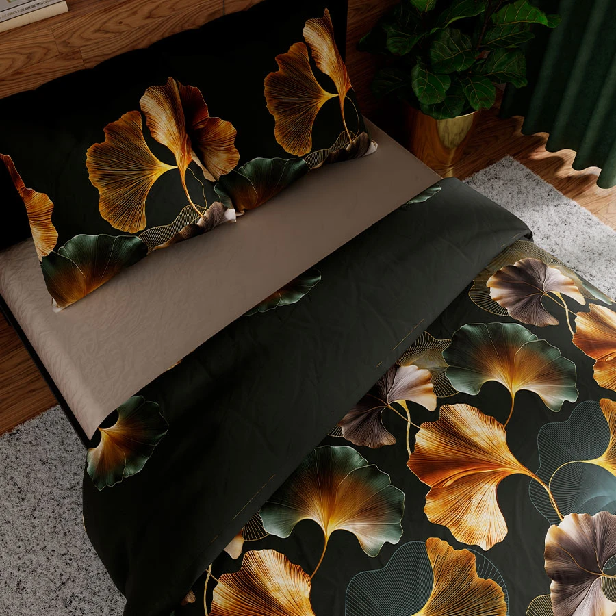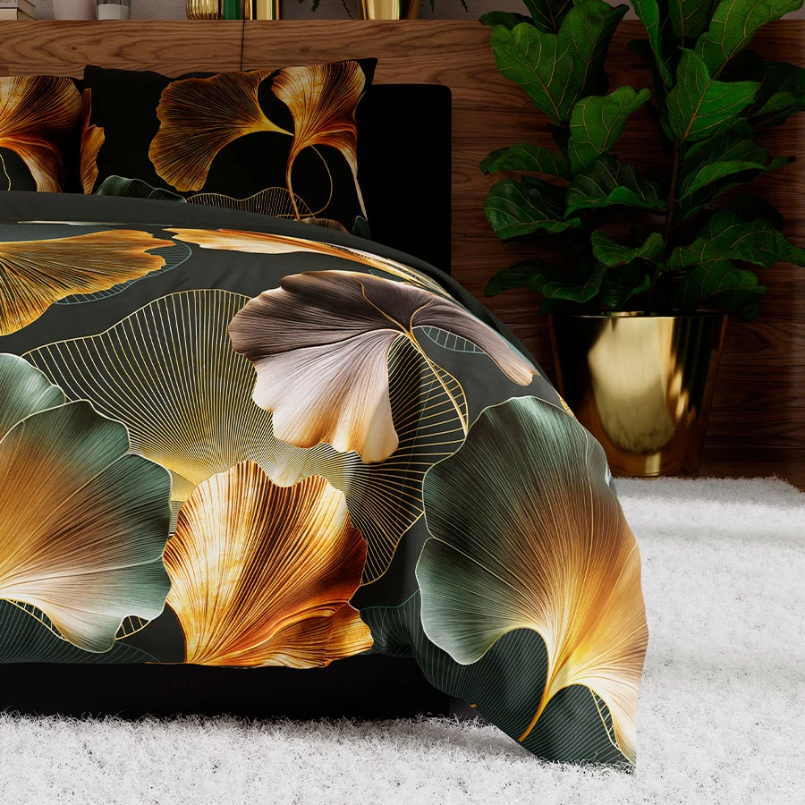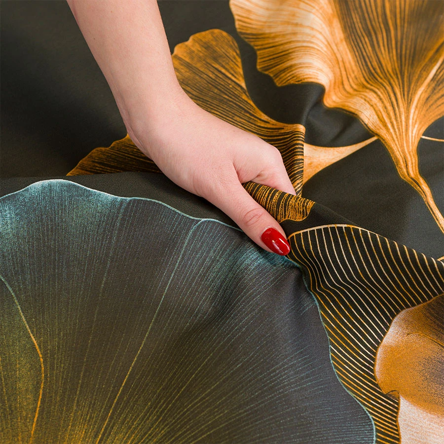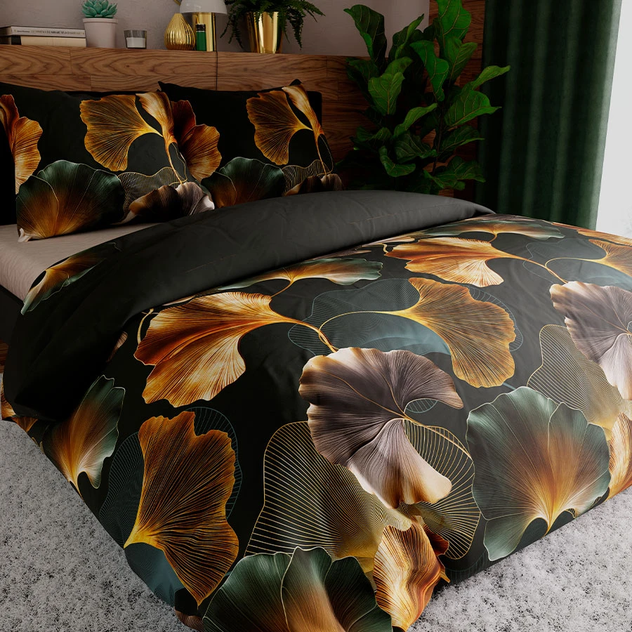 Pościel MARISEL to połączenie elegancji i nowoczesnego wzornictwa. Ciemna baza kontrastująca z złocistymi i zielonymi liśćmi miłorzębu tworzy spektakularny efekt, który przyciąga wzrok i dodaje wnętrzu wyrafinowanego stylu. Idealna do sypialni w stylu glamour, nowoczesnym lub art deco, gdzie liczy się wyjątkowy design i ponadczasowy szyk.