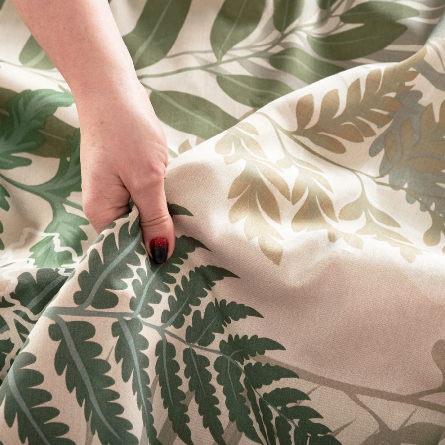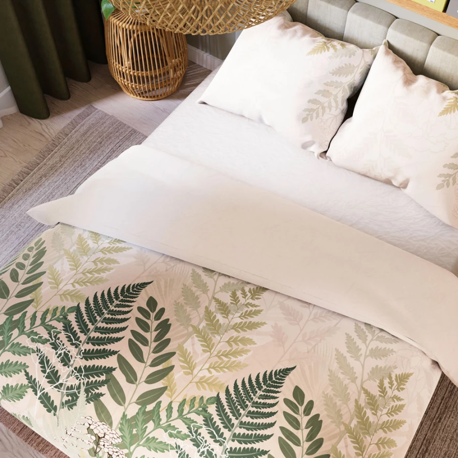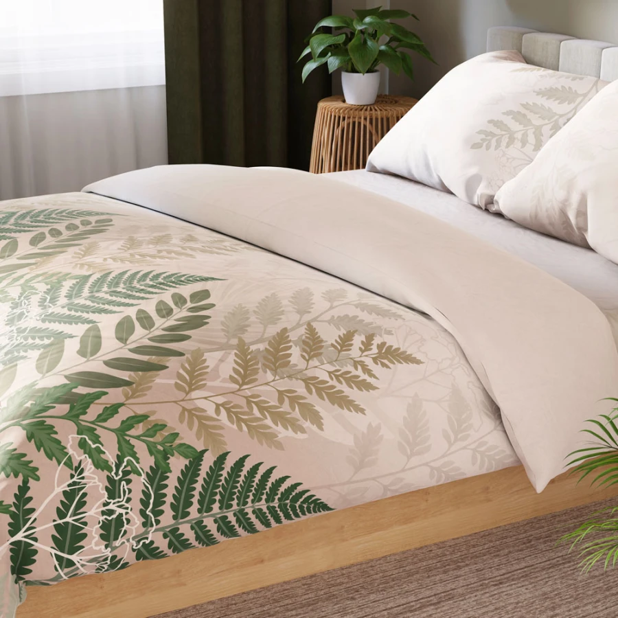 Zanurz się w kojącym otoczeniu natury z pościelą FERNA! Delikatny botaniczny wzór w odcieniach zieleni i beżu sprawia, że sypialnia nabiera harmonijnego, relaksującego charakteru. Liście paproci i subtelne akcenty roślinne dodają wnętrzu świeżości, idealnie wpisując się w aranżacje boho, skandynawskie, rustykalne i eko.