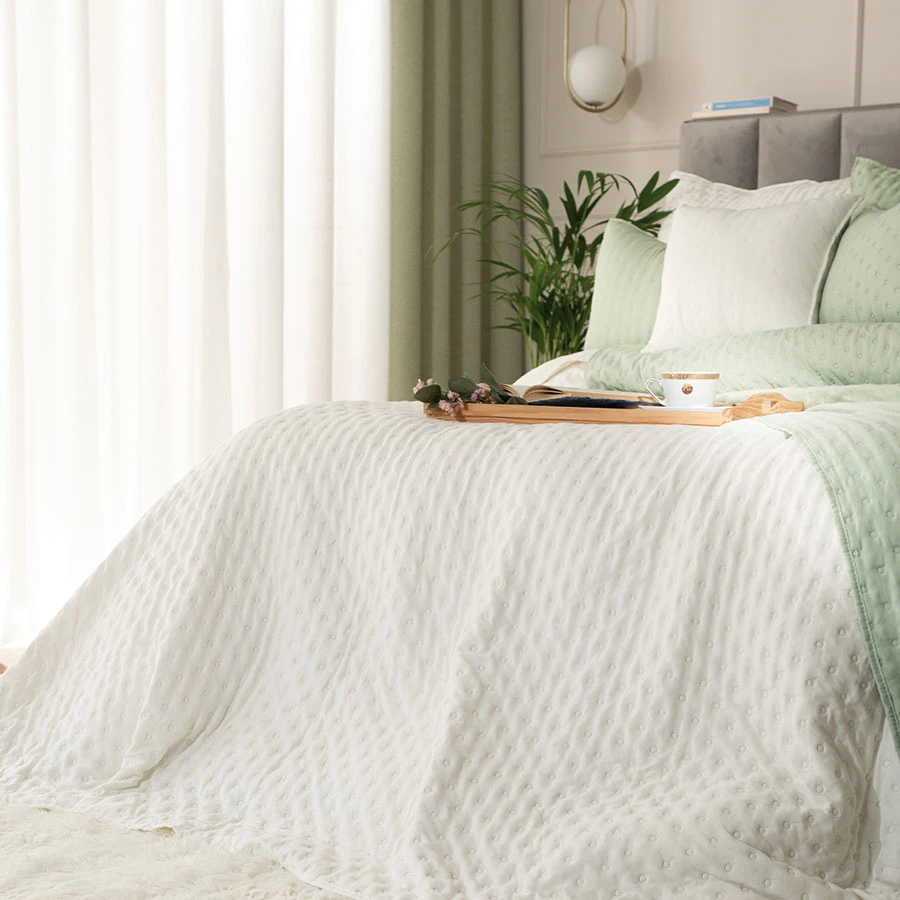 Ta wyjątkowa narzuta to nie tylko piękny element dekoracyjny, ale także praktyczny dodatek, który ochroni Twoją pościel przed kurzem i zabrudzeniami. Jej uniwersalny kolor i delikatny wzór doskonale komponują się z różnymi stylami wnętrzarskimi, od skandynawskiego po klasyczny.