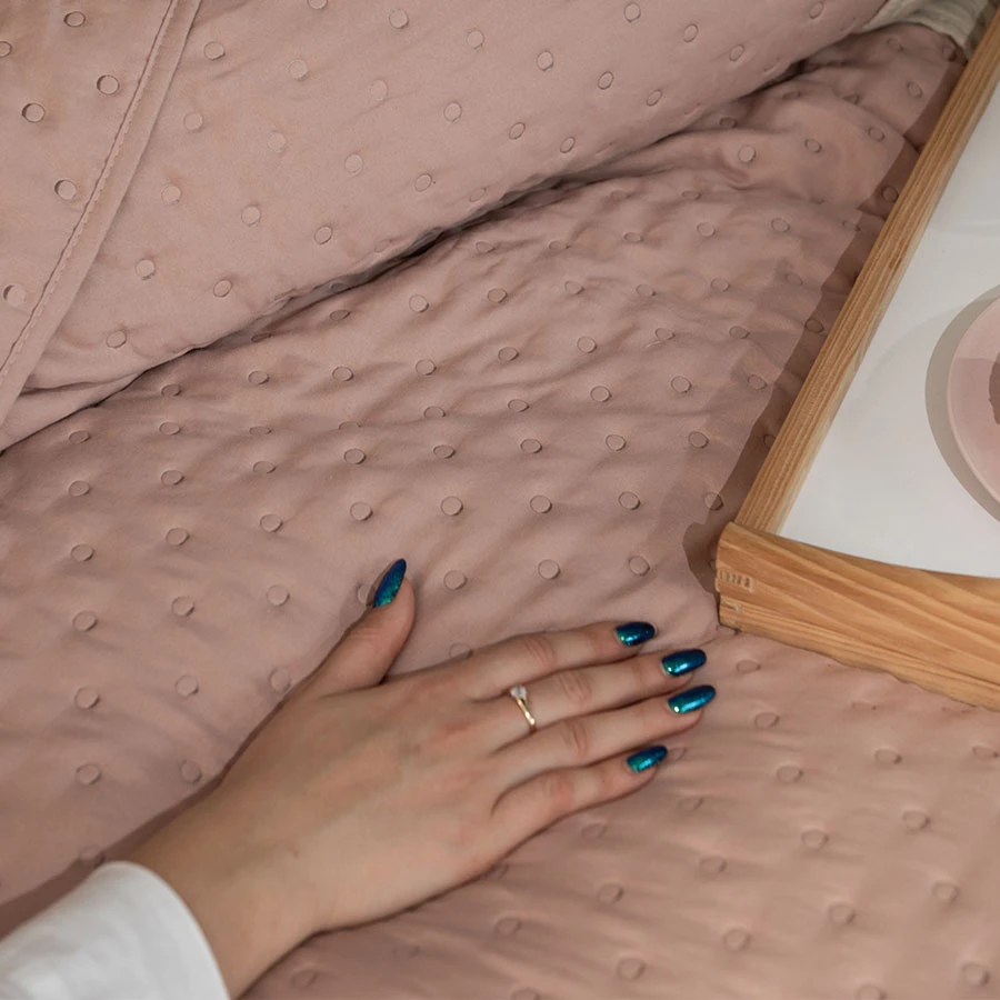 Szukasz sposobu na dodanie sypialni przytulnego, a zarazem eleganckiego charakteru? Narzuta NULES w delikatnym, pudrowym różu to strzał w dziesiątkę! Jej miękki, przyjemny w dotyku materiał i subtelny, tłoczony wzór sprawią, że Twoja sypialnia stanie się oazą spokoju. Wyobraź sobie relaks pod miękką narzutą, otulającą Cię w chłodne wieczory. ✨