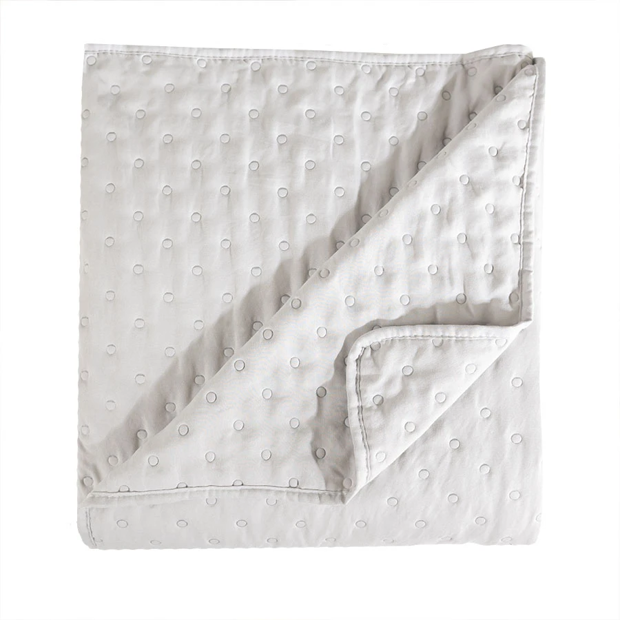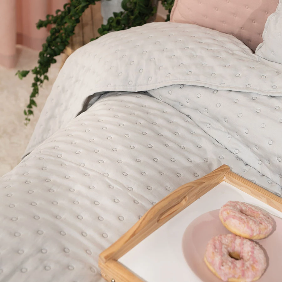 Narzuta NULES w jasnoszarym odcieniu to kwintesencja elegancji i subtelności. Jej unikalny, tłoczony wzór w delikatne kółka dodaje jej trójwymiarowego efektu i czyni ją niezwykle przyjemną w dotyku. Wykonana z wysokiej jakości materiału, narzuta otuli Cię miękkością i zapewni komfortowy wypoczynek. Doskonale sprawdzi się jako element dekoracyjny sypialni urządzonej w stylu nowoczesnym, skandynawskim lub glamour. Jej uniwersalny kolor i subtelny wzór łatwo dopasować do różnorodnych aranżacji wnętrz.