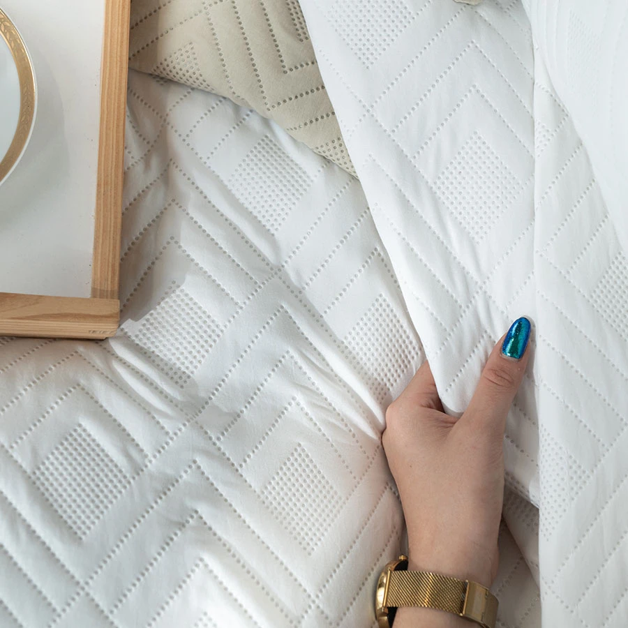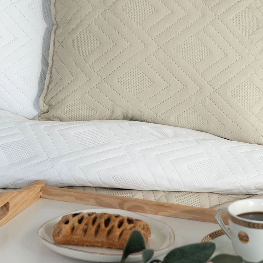 Narzuta AVILA w odcieniu śnieżnej bieli to synonim elegancji i świeżości. Jej unikalny, geometryczny wzór dodaje jej trójwymiarowego efektu i czyni ją niezwykle przyjemną w dotyku. Wykonana z wysokiej jakości materiału, narzuta otuli Cię miękkością i zapewni komfortowy wypoczynek. Doskonale sprawdzi się jako element dekoracyjny sypialni urządzonej w stylu minimalistycznym, skandynawskim lub glamour. Jej uniwersalny kolor i subtelny wzór łatwo dopasować do różnorodnych aranżacji wnętrz.