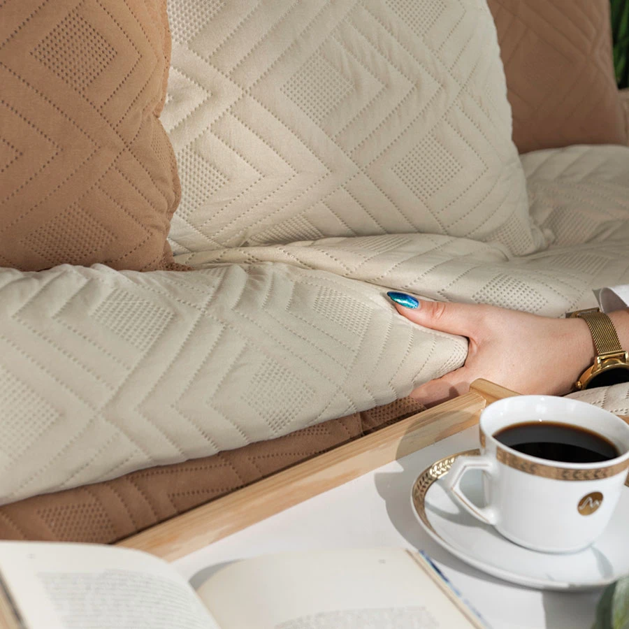 Wyobraź sobie relaksujący wieczór w otoczeniu miękkiej narzuty AVILA. Beżowy kolor wprowadzi do Twojego wnętrza harmonię i spokój, a geometryczny wzór doda mu nowoczesnego charakteru.