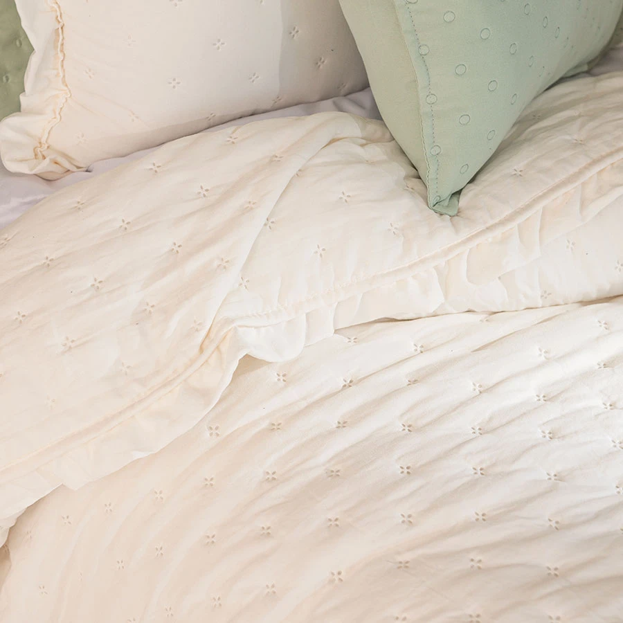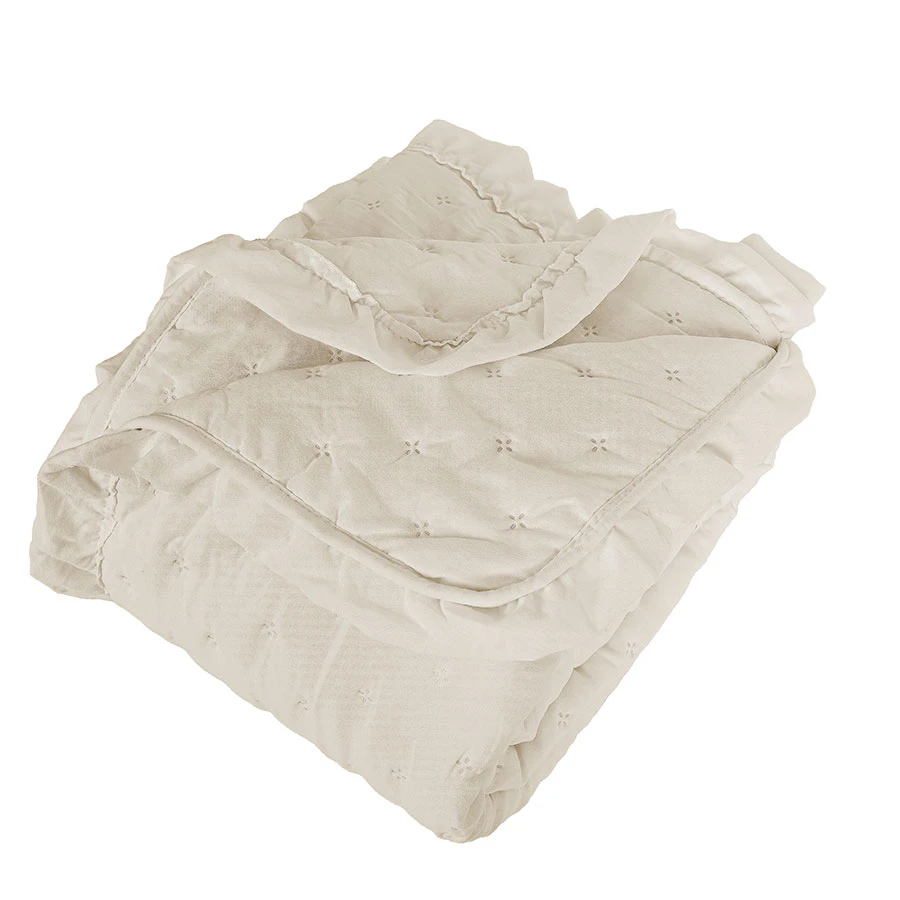 Narzuta WERONA zachwyca swoją delikatnością i elegancją. Subtelny kolor ecru wprowadza do mniejszej sypialni ciepłą i kojącą atmosferę, idealną do relaksu po ciężkim dniu. Romantyczna falbana dodaje narzucie lekkości i uroku, a pikowany wzór nadaje jej trójwymiarowości. Materiał jest miękki i przyjemny w dotyku, co sprawia, że narzuta jest idealna do otulenia się w chłodne wieczory.