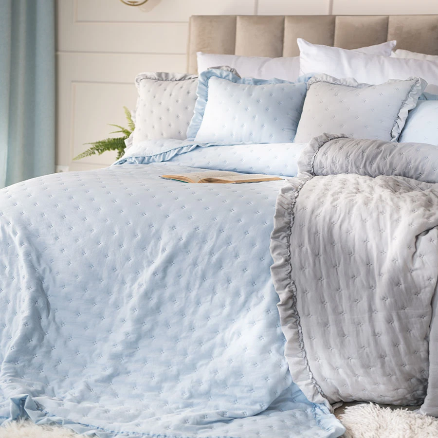 Narzuta WERONA zachwyca swoją delikatnością i elegancją. Subtelny kolor baby blue wprowadza do sypialni ciepłą i kojącą atmosferę, idealną do relaksu po ciężkim dniu. Romantyczna falbana dodaje narzucie lekkości i uroku, a pikowany wzór nadaje jej trójwymiarowości. Materiał jest miękki i przyjemny w dotyku, co sprawia, że narzuta jest idealna do otulenia się w chłodne wieczory.