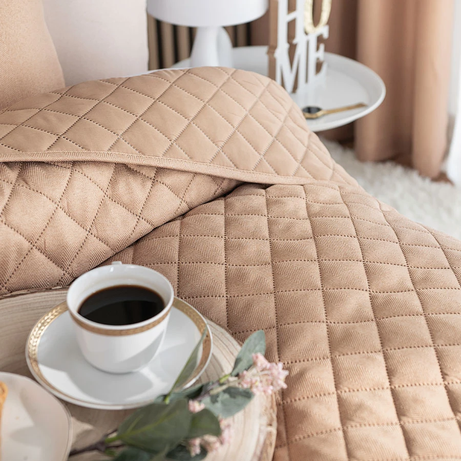 Narzuta JODEŁKA to nie tylko komfort, ale również wyjątkowy design. Delikatny pikowany wzór dodaje jej elegancji i podkreśla wysoką jakość wykonania. Ciemny beżowy odcień doskonale komponuje się z różnorodnymi stylami wnętrzarskimi – od klasycznych po nowoczesne. Narzuta będzie idealnym uzupełnieniem aranżacji sypialni, dodając jej luksusowego charakteru, ale także świetnie sprawdzi się w salonie jako stylowy dodatek do sofy lub fotela.
